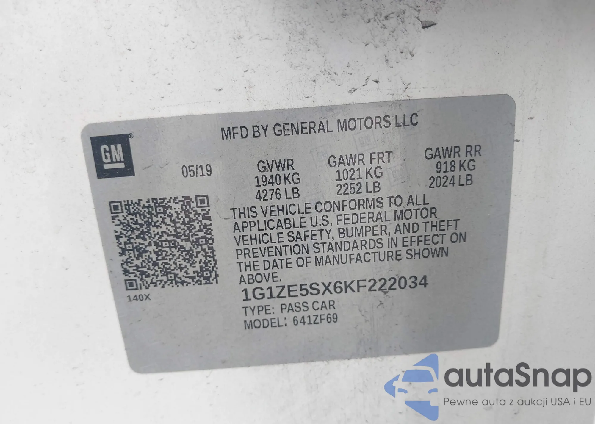 VIN: 1G1ZE5SX6KF222034