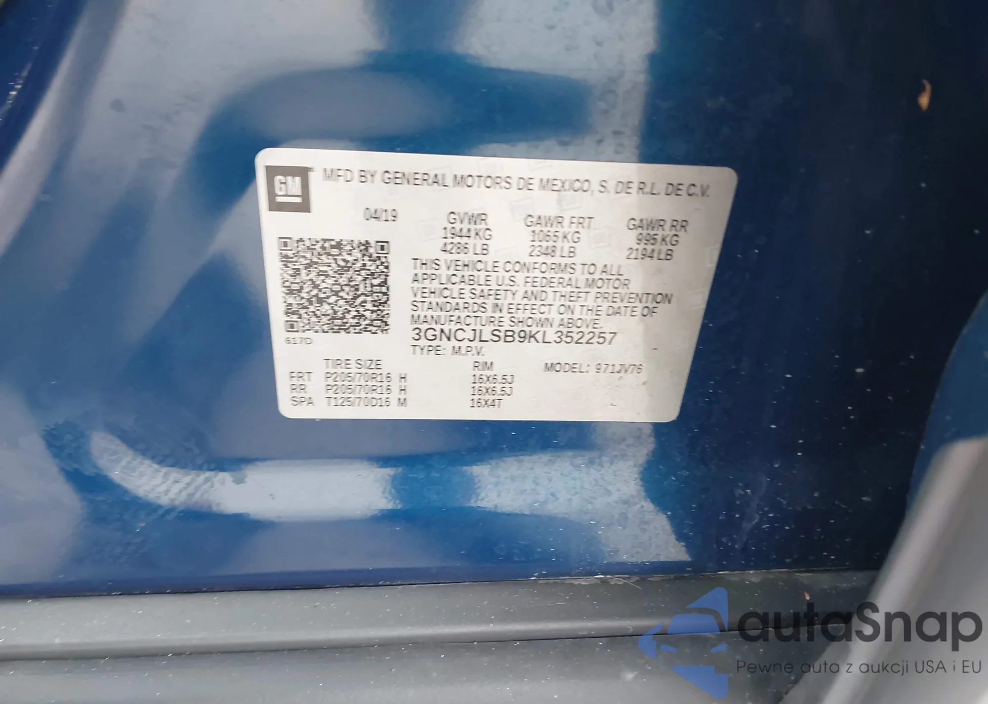 VIN: 3GNCJLSB9KL352257