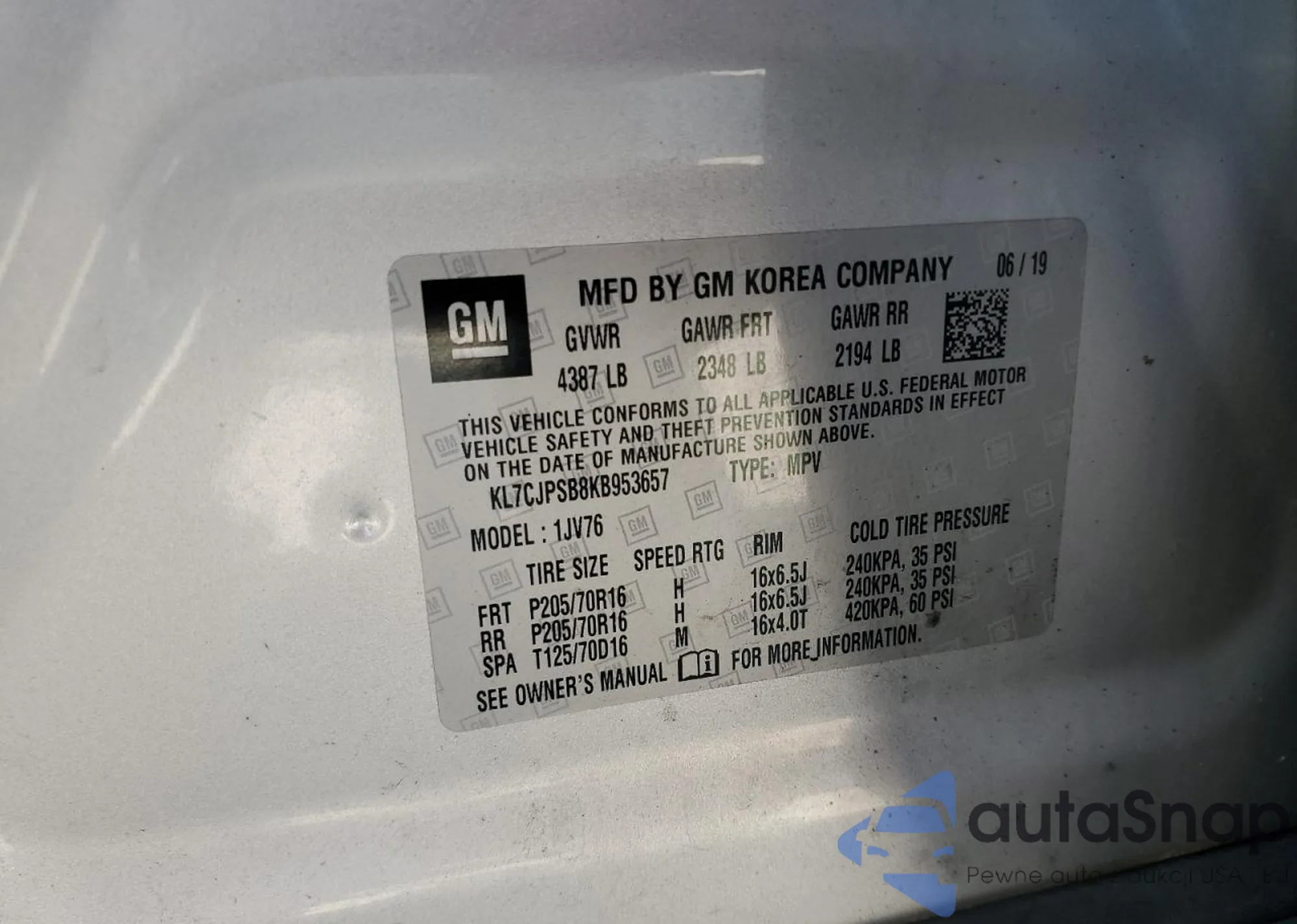 VIN: KL7CJPSB8KB953657