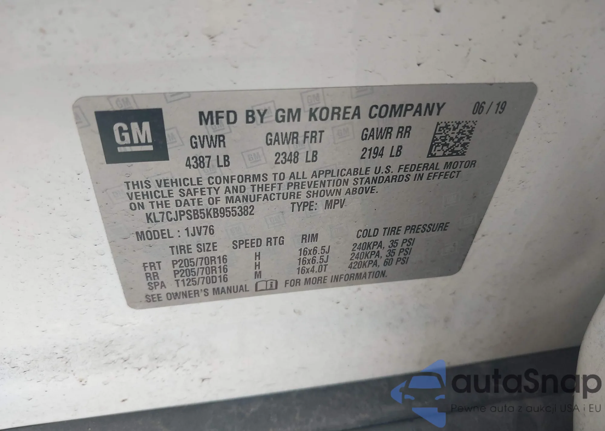 VIN: KL7CJPSB5KB955382