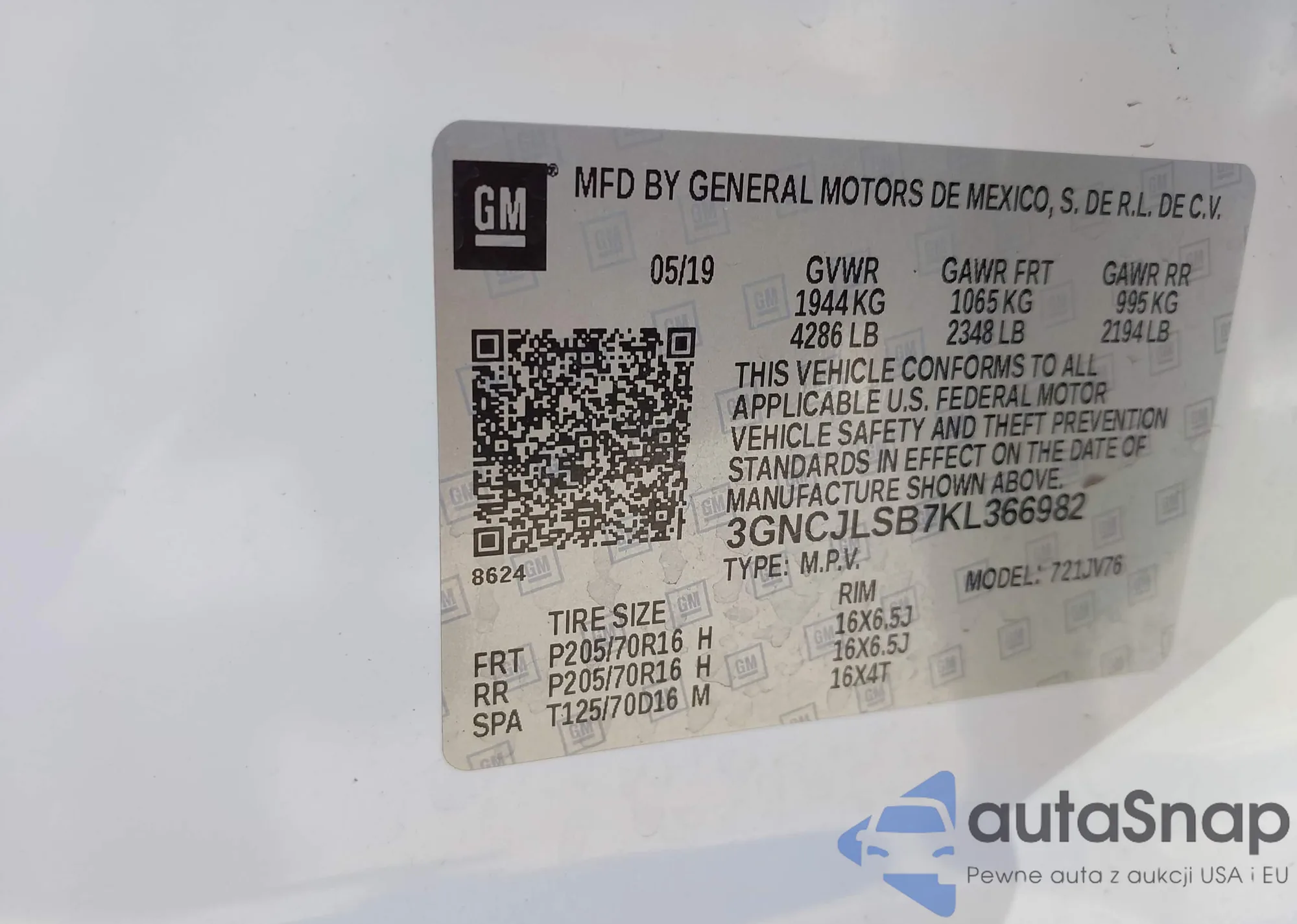 VIN: 3GNCJLSB7KL366982