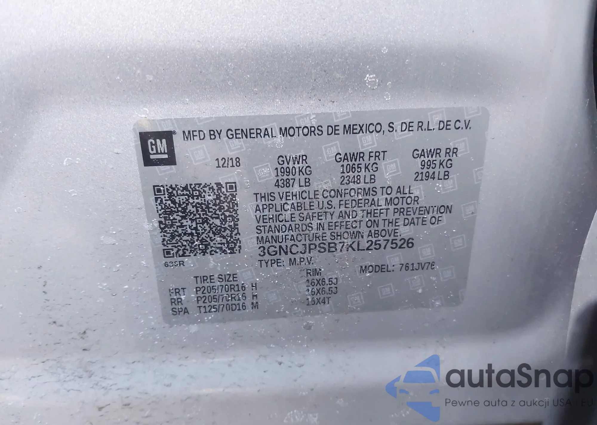 VIN: 3GNCJPSB7KL257526