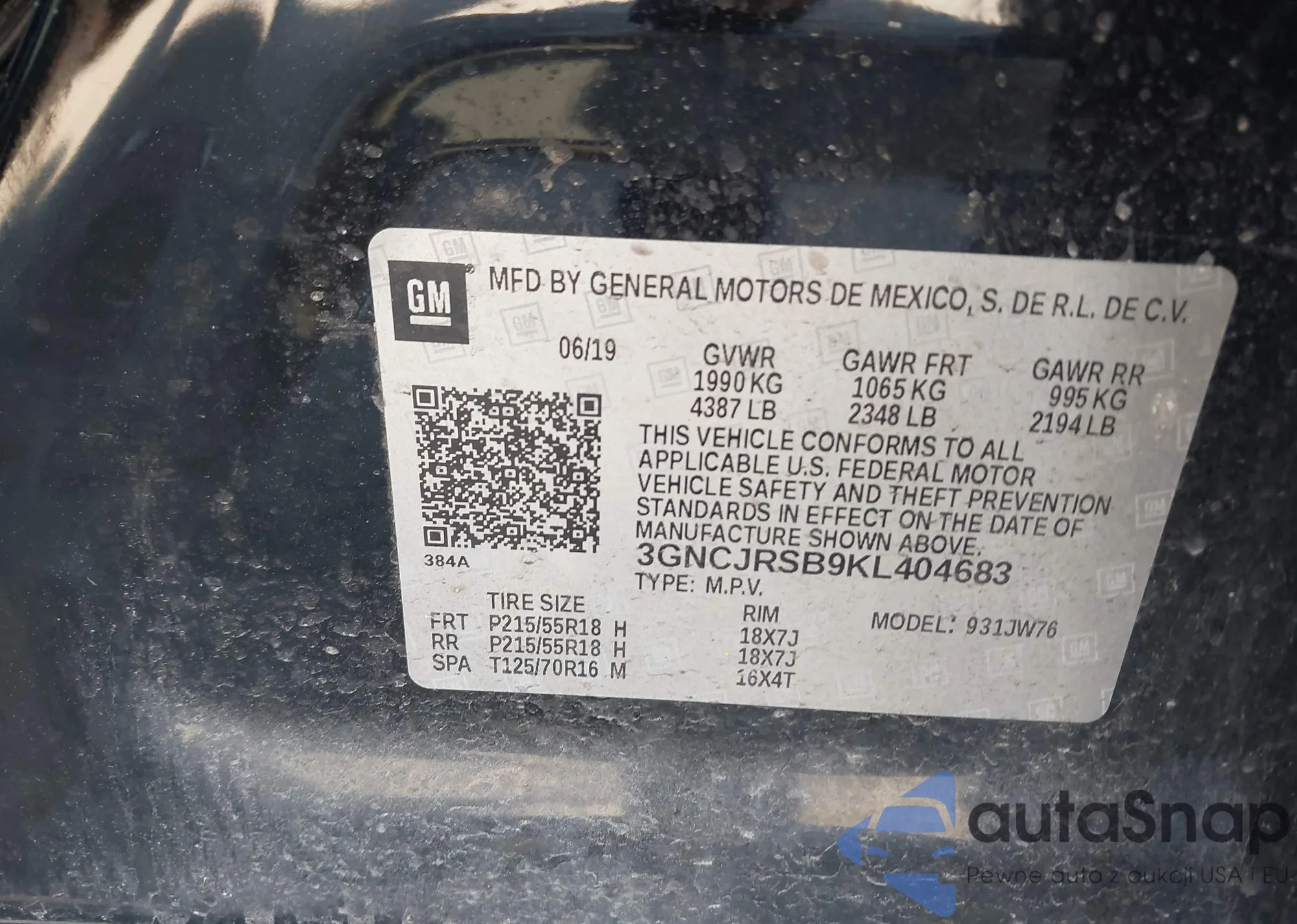 VIN: 3GNCJRSB9KL404683