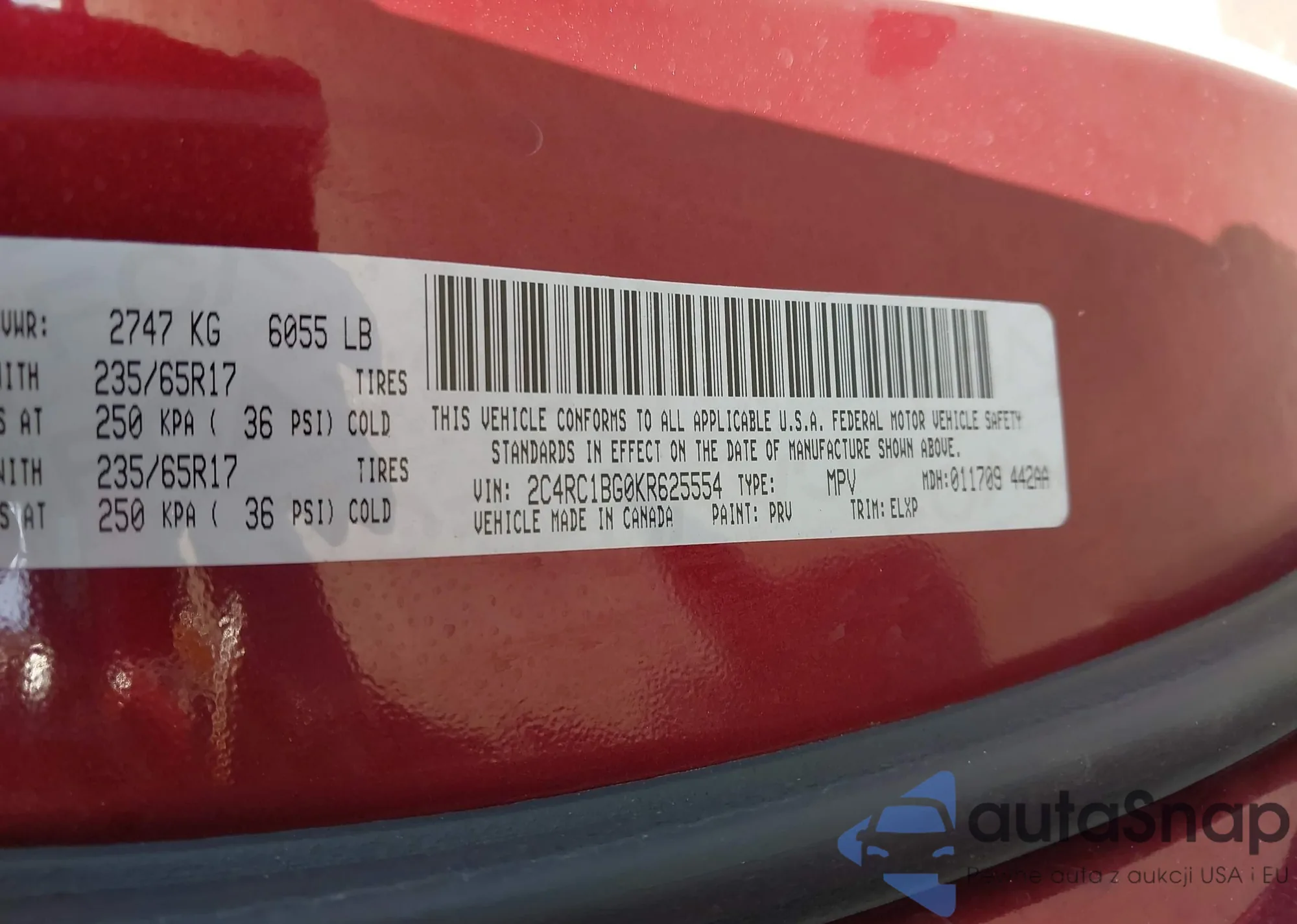 • VIN: 2C4RC1BG0KR625554