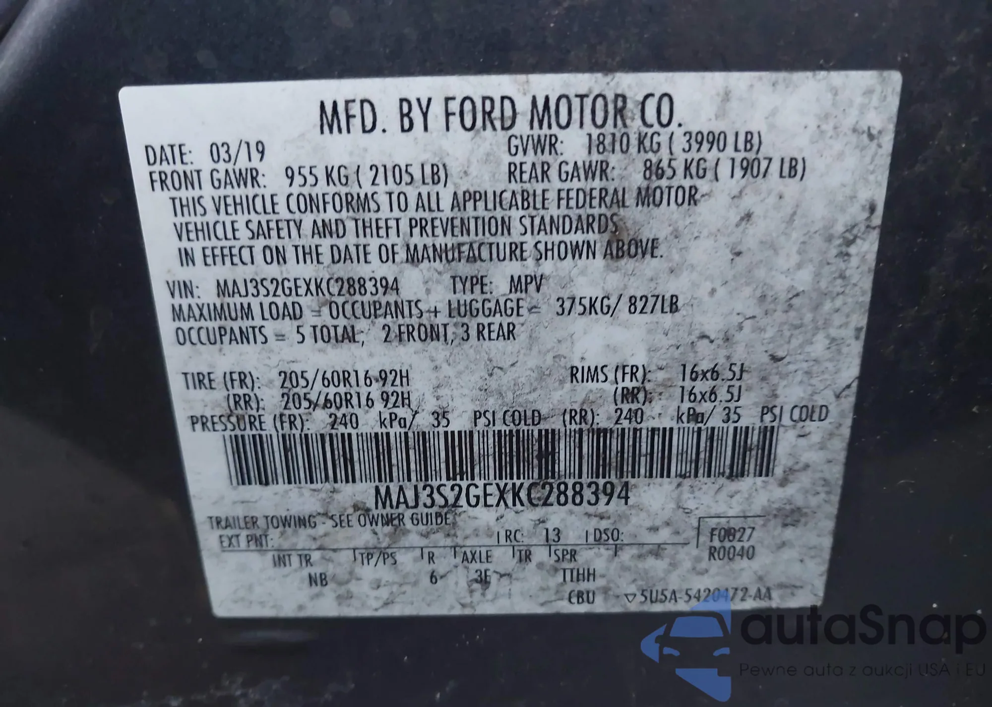 Samochód Ford EcoSport 2019 (VIN MAJ3S2GEXKC288394) nie był wcześniej licytowany. Dokumenty są czyste, przebieg odpowiada lub jest niższy niż średnia rynku. Sprzedaje go firma ubezpieczeniowa – polecamy zakup. Dostawa do portu zajmie ok. 6–8 tygodni.