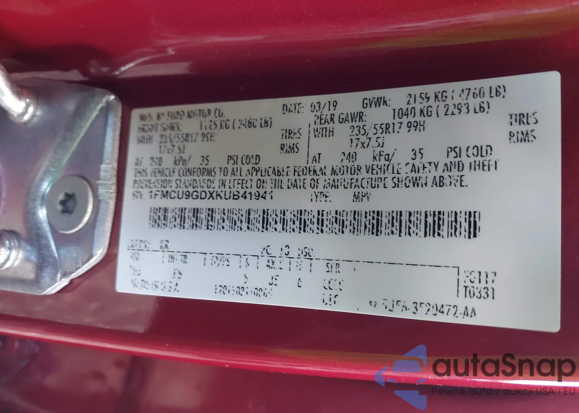 VIN: 1FMCU9GDXKUB41941