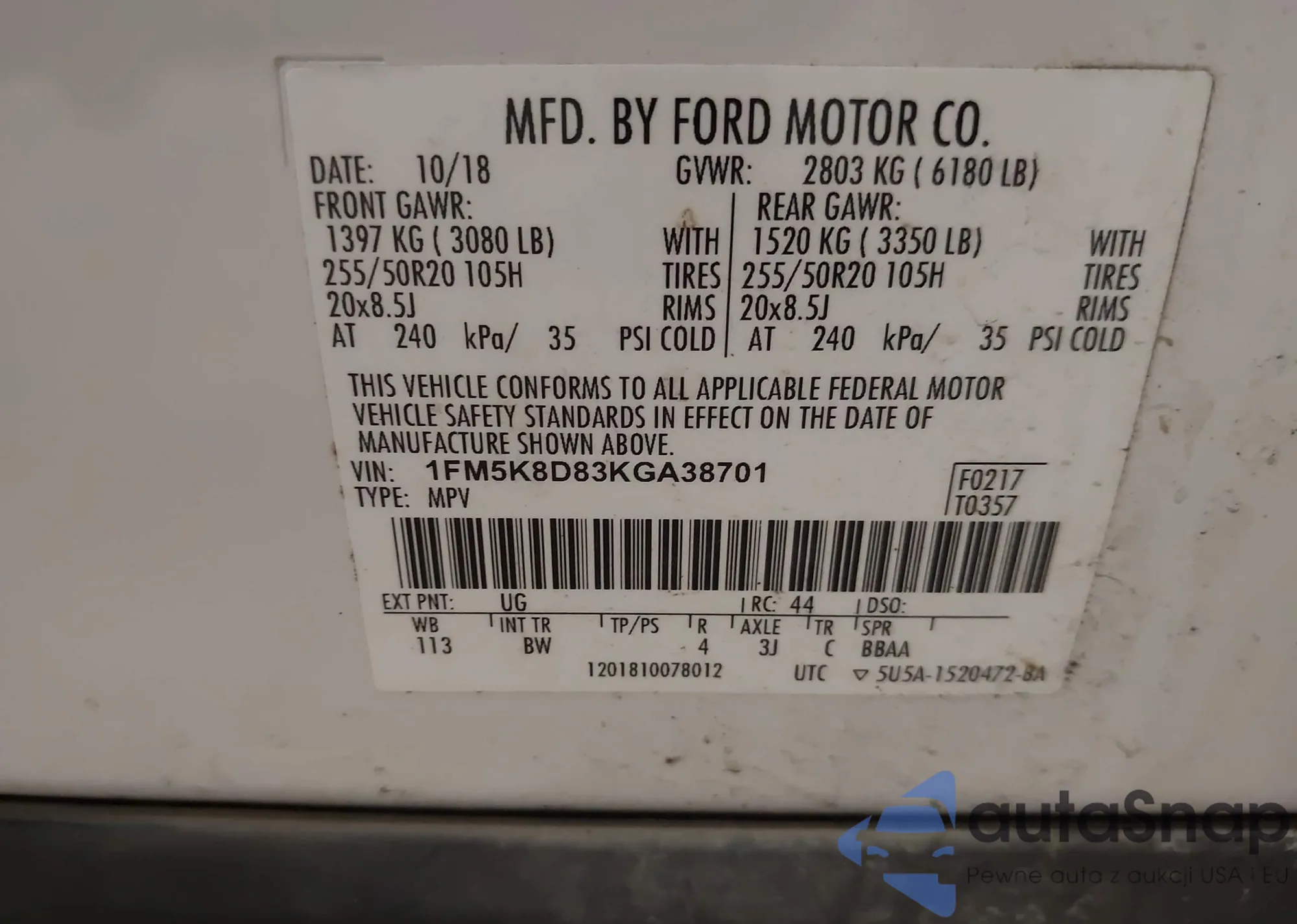 VIN: 1FM5K8D83KGA38701