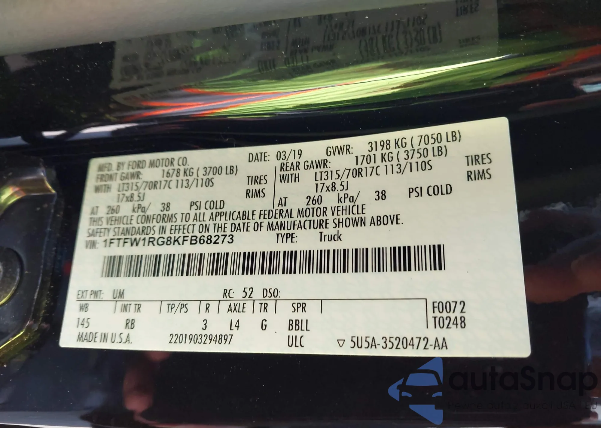 Samochód Ford F-150 2019 (VIN 1FTFW1RG8KFB68273) nie był wcześniej licytowany. Dokumenty są czyste, przebieg odpowiada lub jest niższy niż średnia rynku. Sprzedaje go firma ubezpieczeniowa – polecamy zakup. Dostawa do portu zajmie ok. 6–8 tygodni.