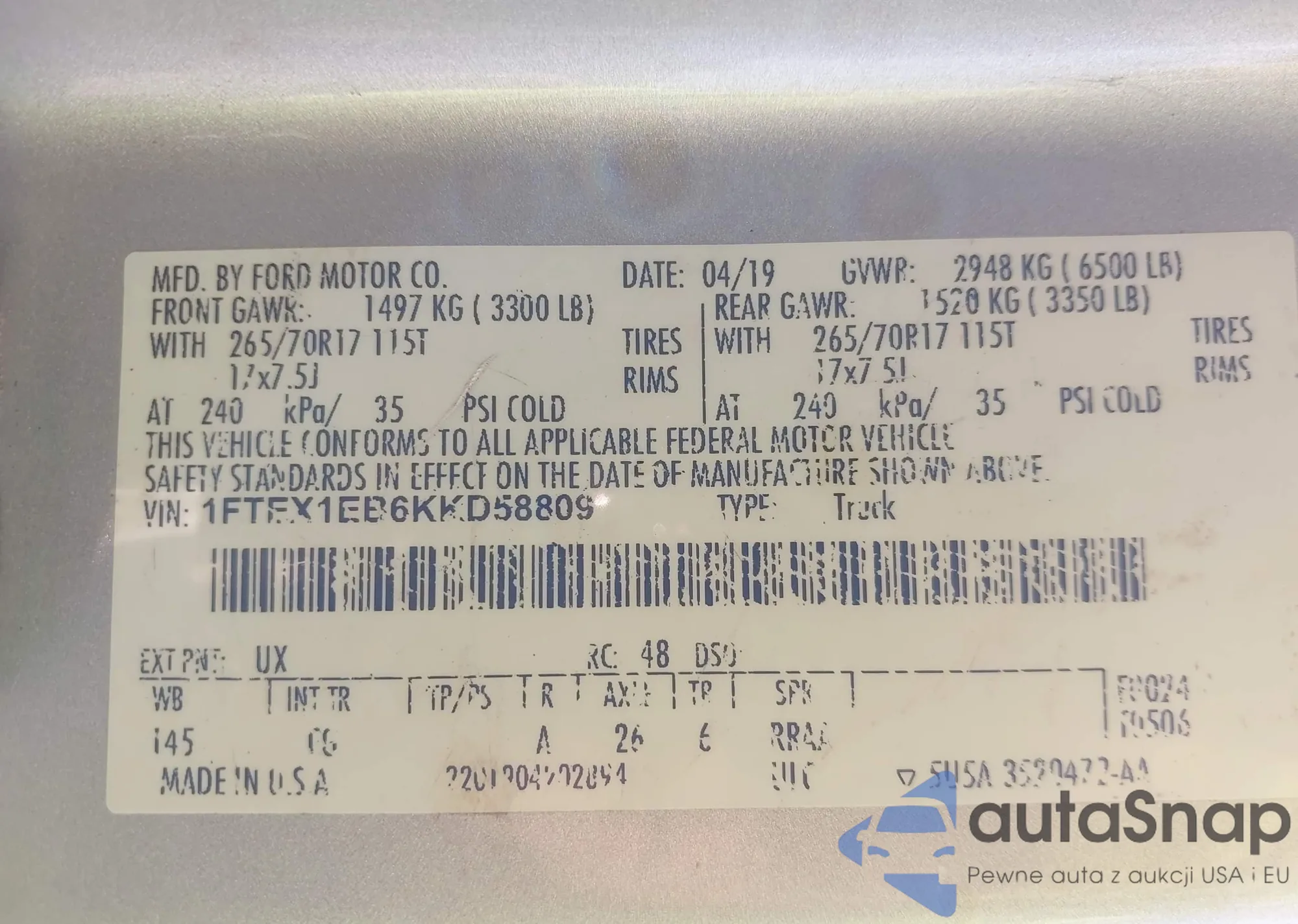 Samochód Ford F-150 2019 (VIN 1FTEX1EB6KKD58809) sprzedaje go niezweryfikowany sprzedawca. Zalecamy raport Carfax i potwierdzenie możliwości rejestracji pojazdu przed zakupem.