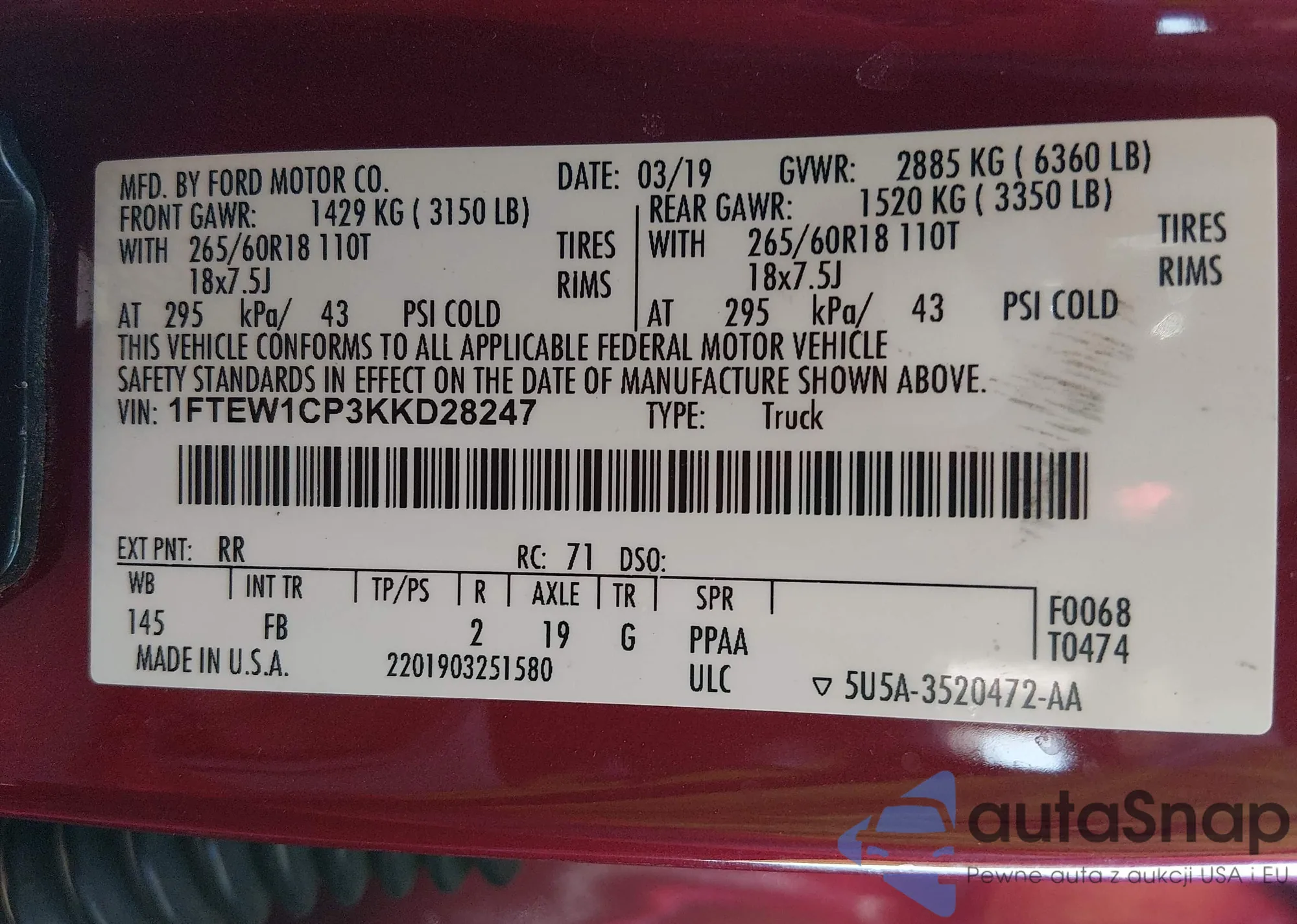 Samochód Ford F-150 2019 (VIN 1FTEW1CP3KKD28247) nie był wcześniej licytowany. Dokumenty są czyste, przebieg odpowiada lub jest niższy niż średnia rynku. Sprzedaje go firma ubezpieczeniowa – polecamy zakup. Dostawa do portu zajmie ok. 6–8 tygodni.
