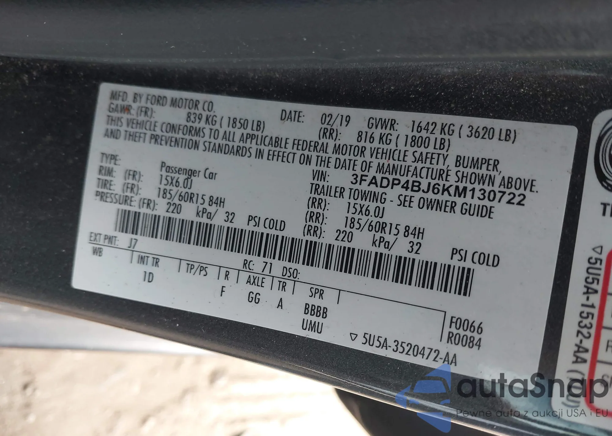 Samochód Ford Fiesta 2019 (VIN 3FADP4BJ6KM130722) nie był wcześniej licytowany. Dokumenty są czyste, przebieg odpowiada lub jest niższy niż średnia rynku. Sprzedaje go firma ubezpieczeniowa – polecamy zakup. Dostawa do portu zajmie ok. 6–8 tygodni.