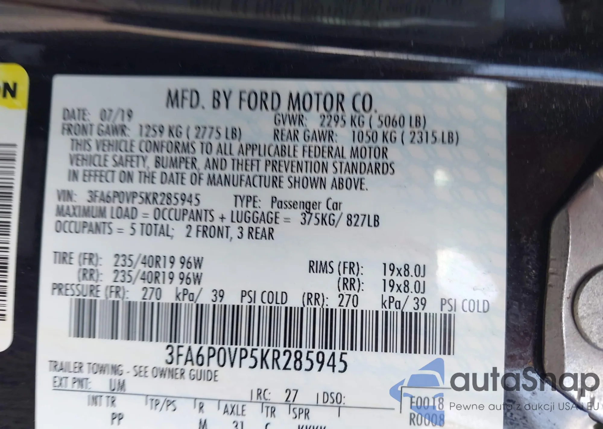 VIN: 3FA6P0VP5KR285945