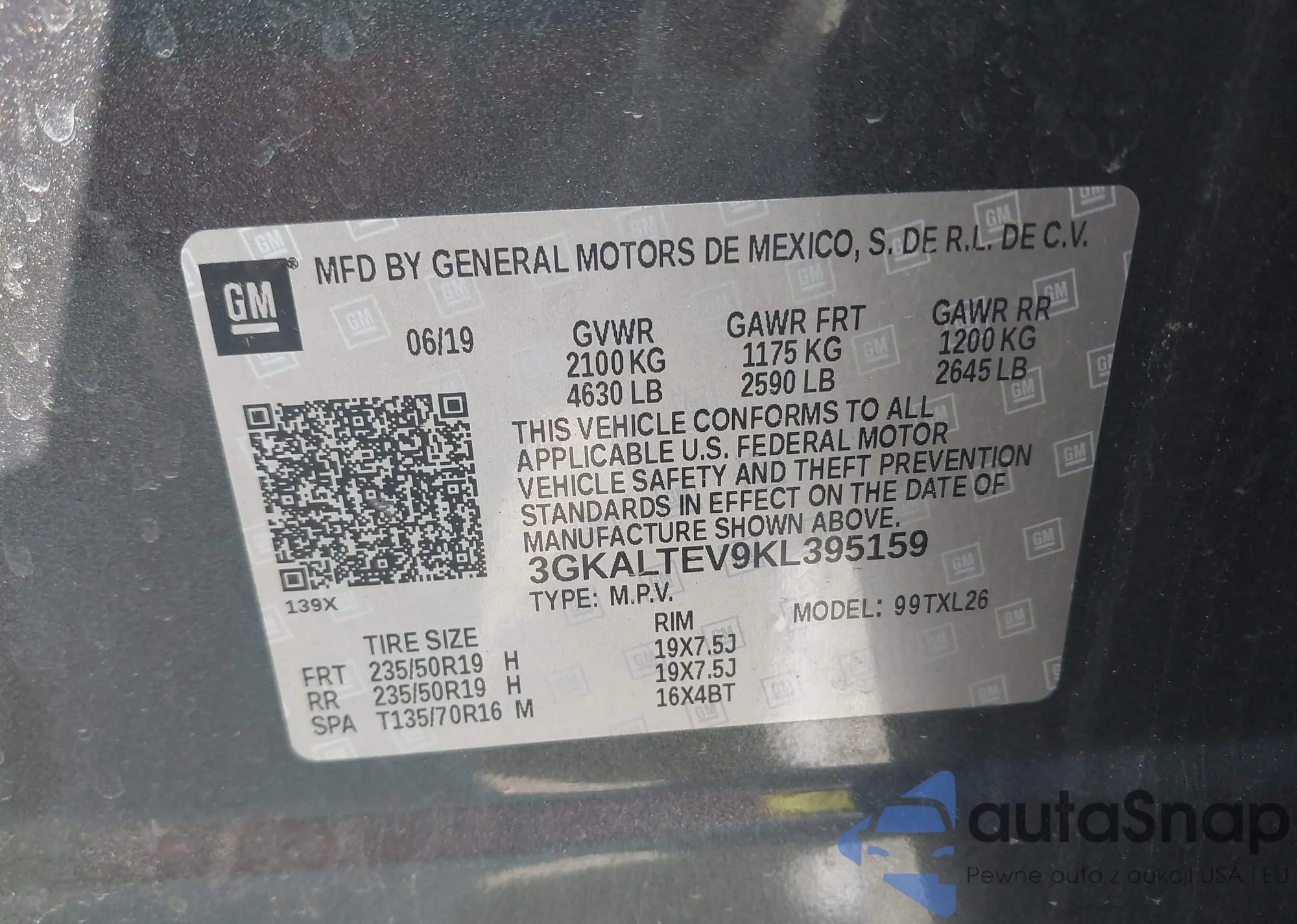 VIN: 3GKALTEV9KL395159
