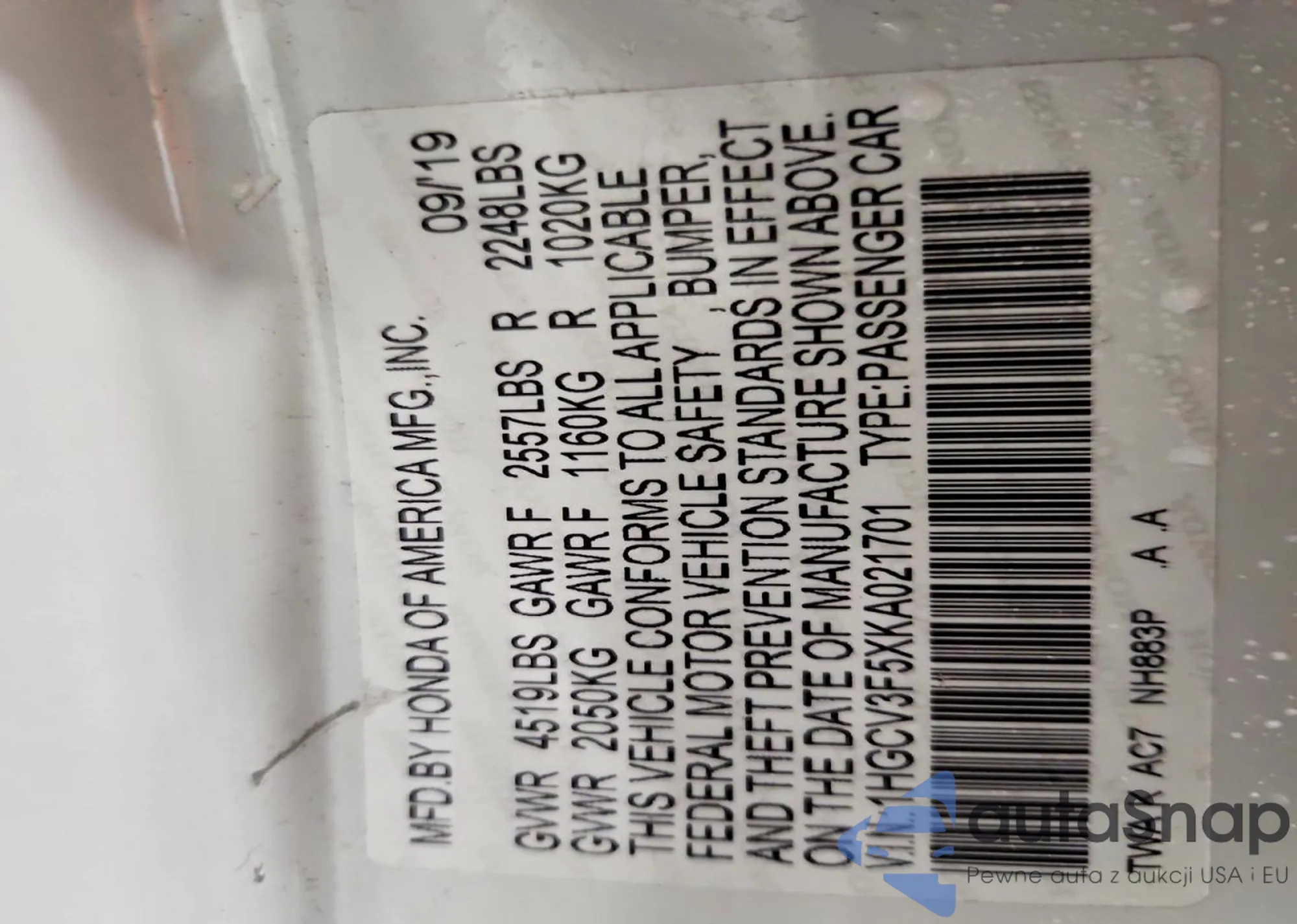 Samochód Honda Accord 2019 (VIN 1HGCV3F5XKA021701) nie był wcześniej licytowany. Dokumenty są czyste, przebieg odpowiada lub jest niższy niż średnia rynku. Sprzedaje go firma ubezpieczeniowa – polecamy zakup. Dostawa do portu zajmie ok. 6–8 tygodni.