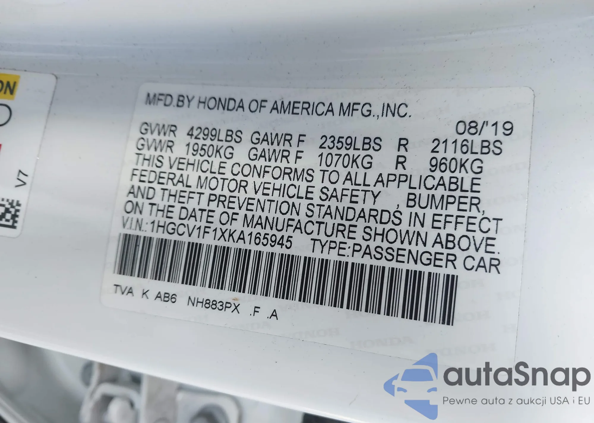 Samochód Honda Accord 2019 (VIN 1HGCV1F1XKA165945) nie był wcześniej licytowany. Dokumenty są czyste, przebieg odpowiada lub jest niższy niż średnia rynku. Sprzedaje go firma ubezpieczeniowa – polecamy zakup. Dostawa do portu zajmie ok. 6–8 tygodni.