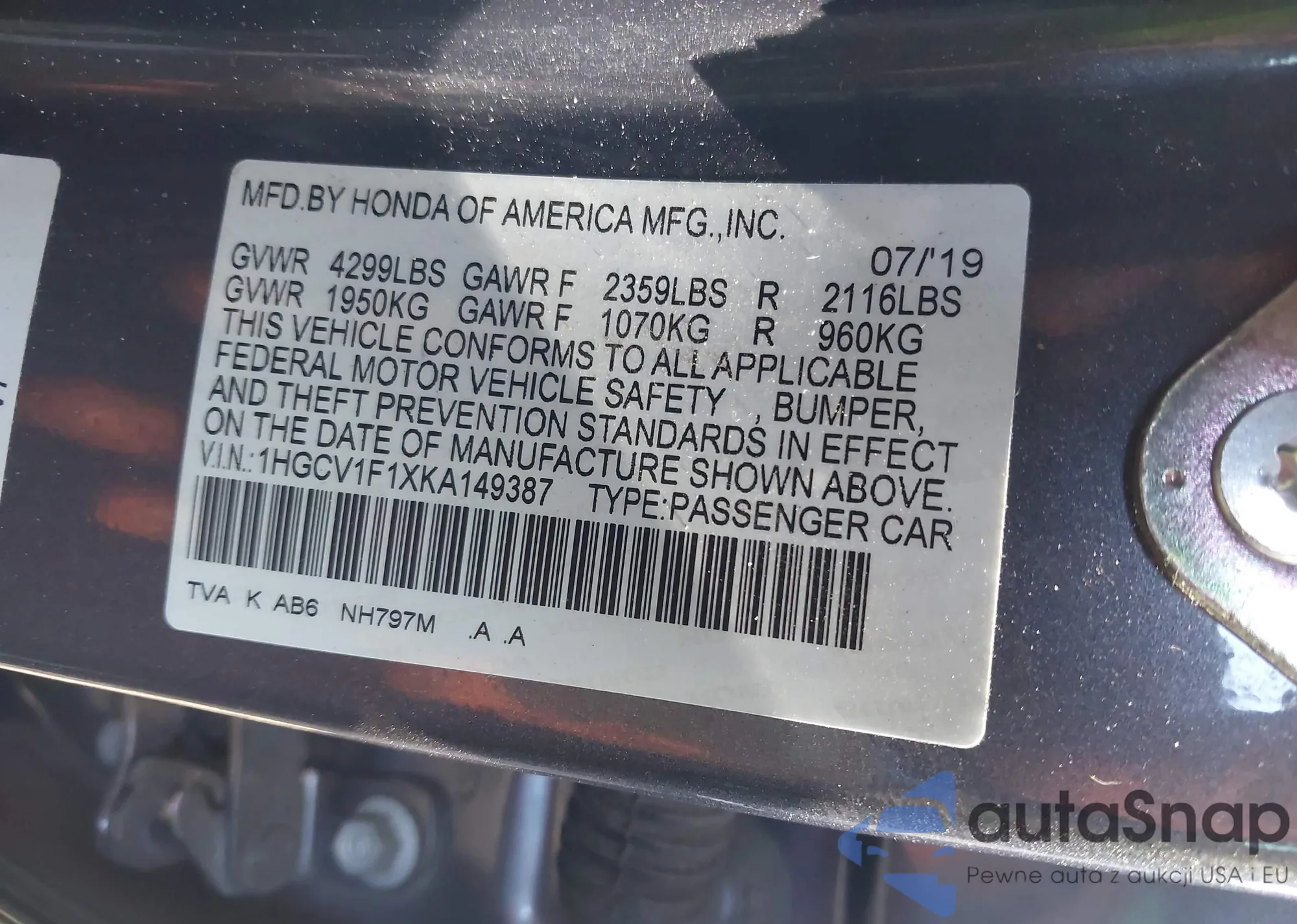 • VIN: 1HGCV1F1XKA149387