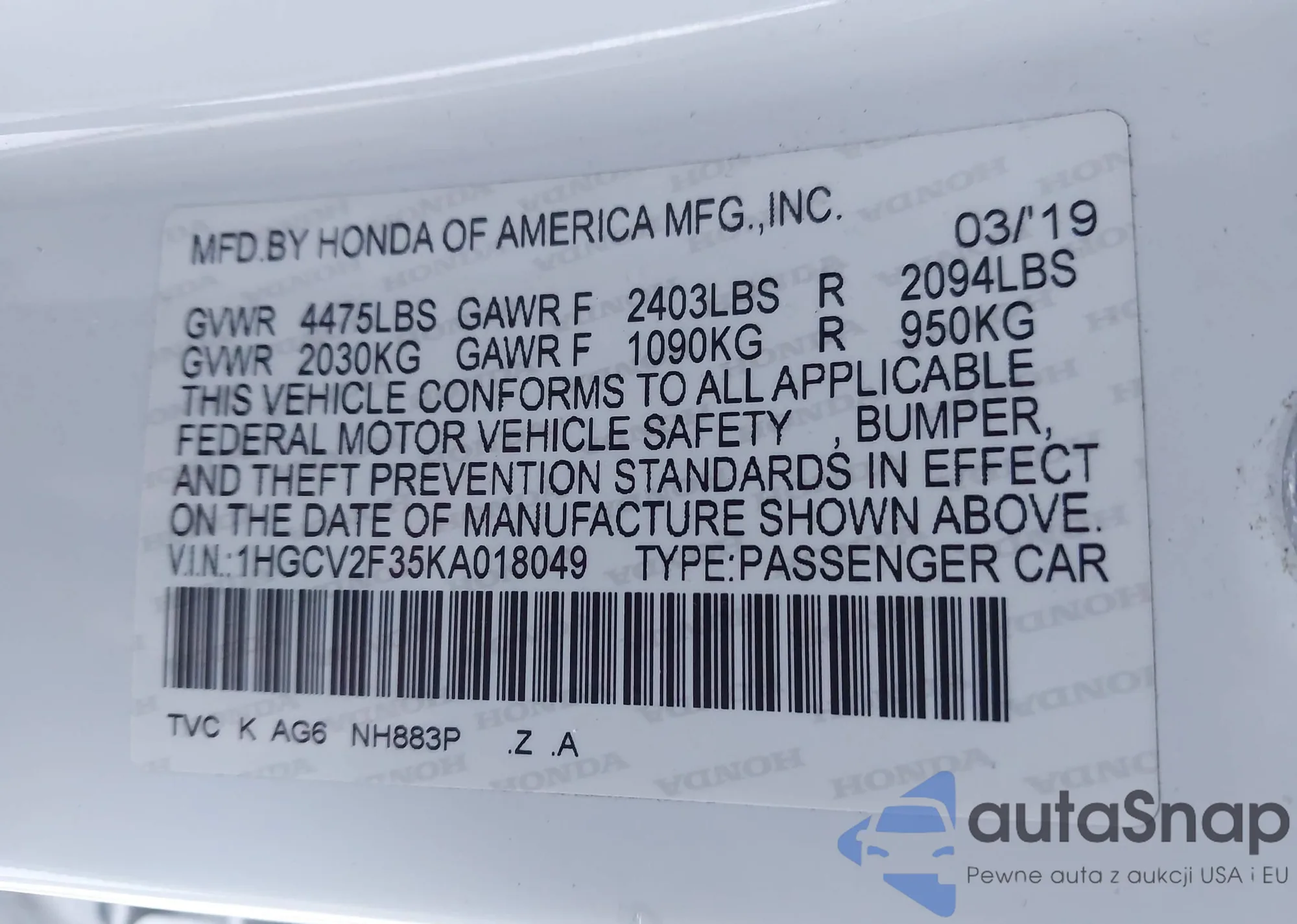 VIN: 1HGCV2F35KA018049