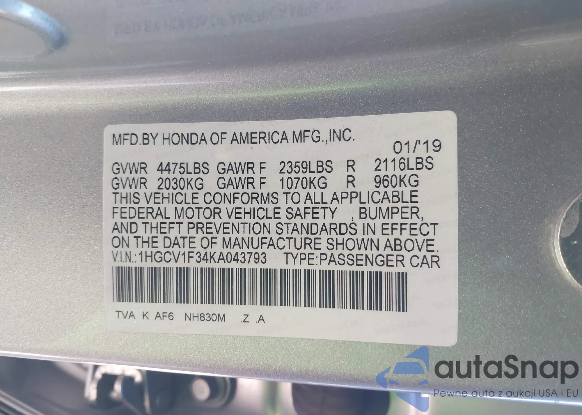 Samochód Honda Accord 2019 (VIN 1HGCV1F34KA043793) był już licytowany 1 razy i/lub sprzedaje go niezweryfikowany sprzedawca. Zalecamy raport Carfax i potwierdzenie możliwości rejestracji pojazdu przed zakupem.
