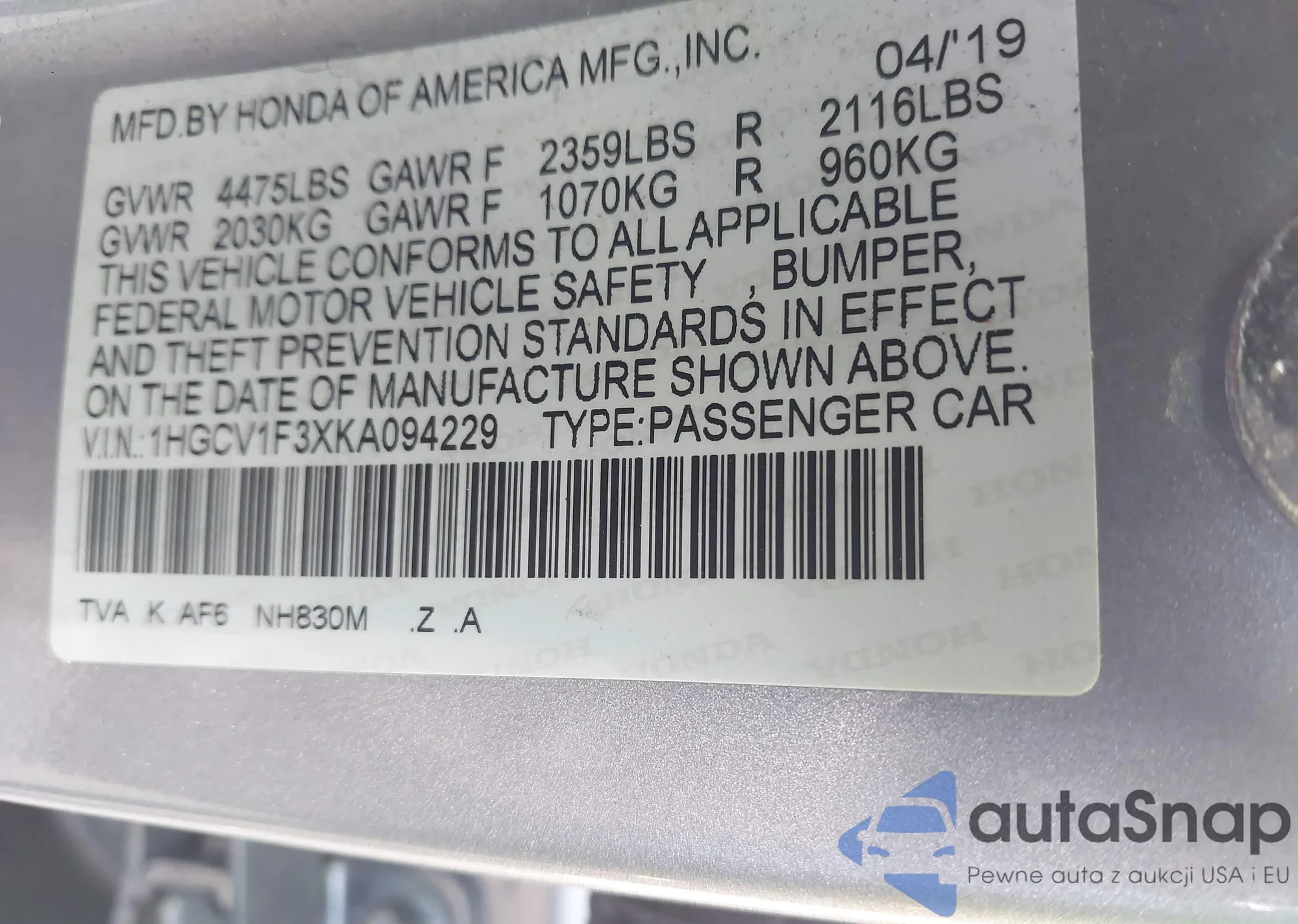 VIN: 1HGCV1F3XKA094229