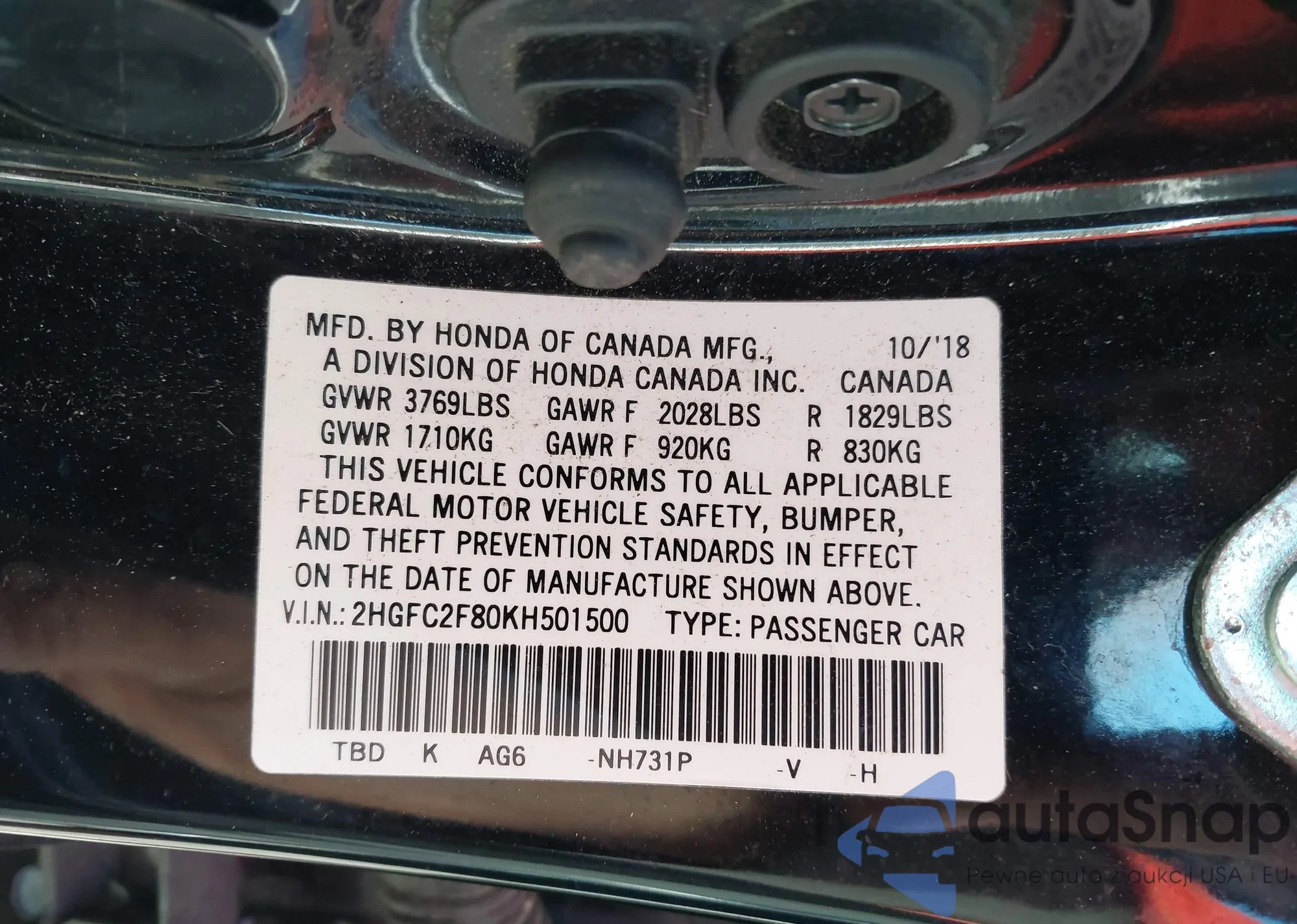 VIN: 2HGFC2F80KH501500