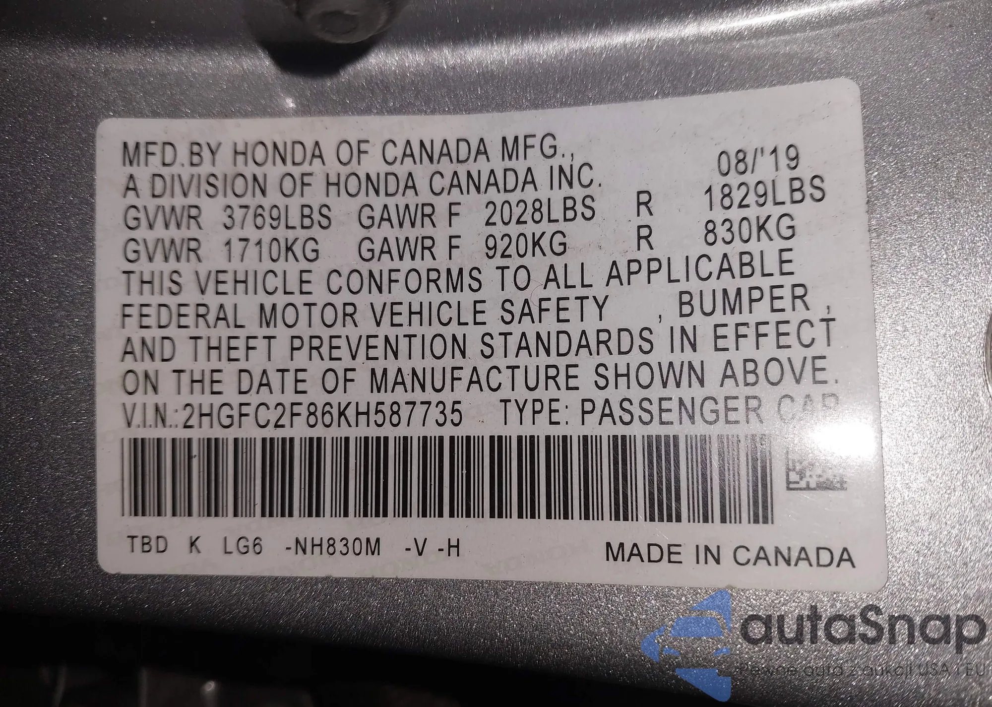 VIN: 2HGFC2F86KH587735