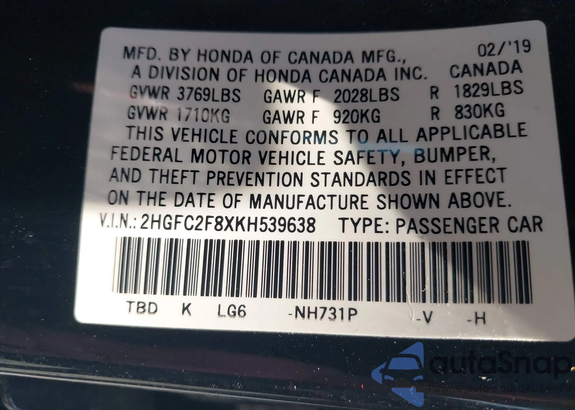 VIN: 2HGFC2F8XK8539638