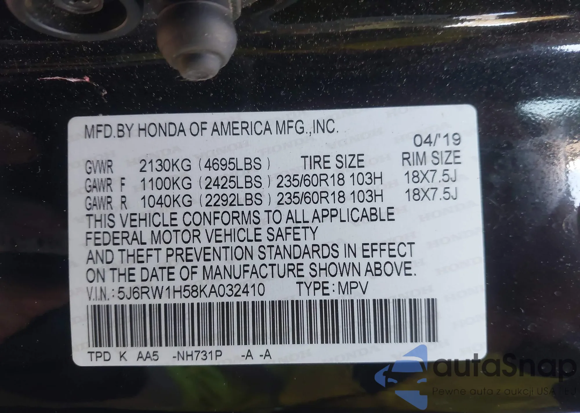 VIN: 5J6RW1H58KA032410