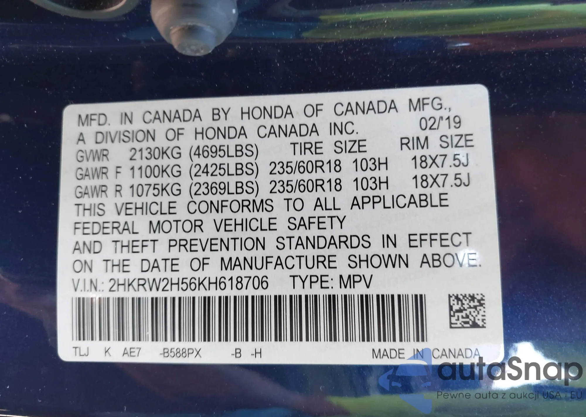 VIN: 2HKRW2H56KH618706