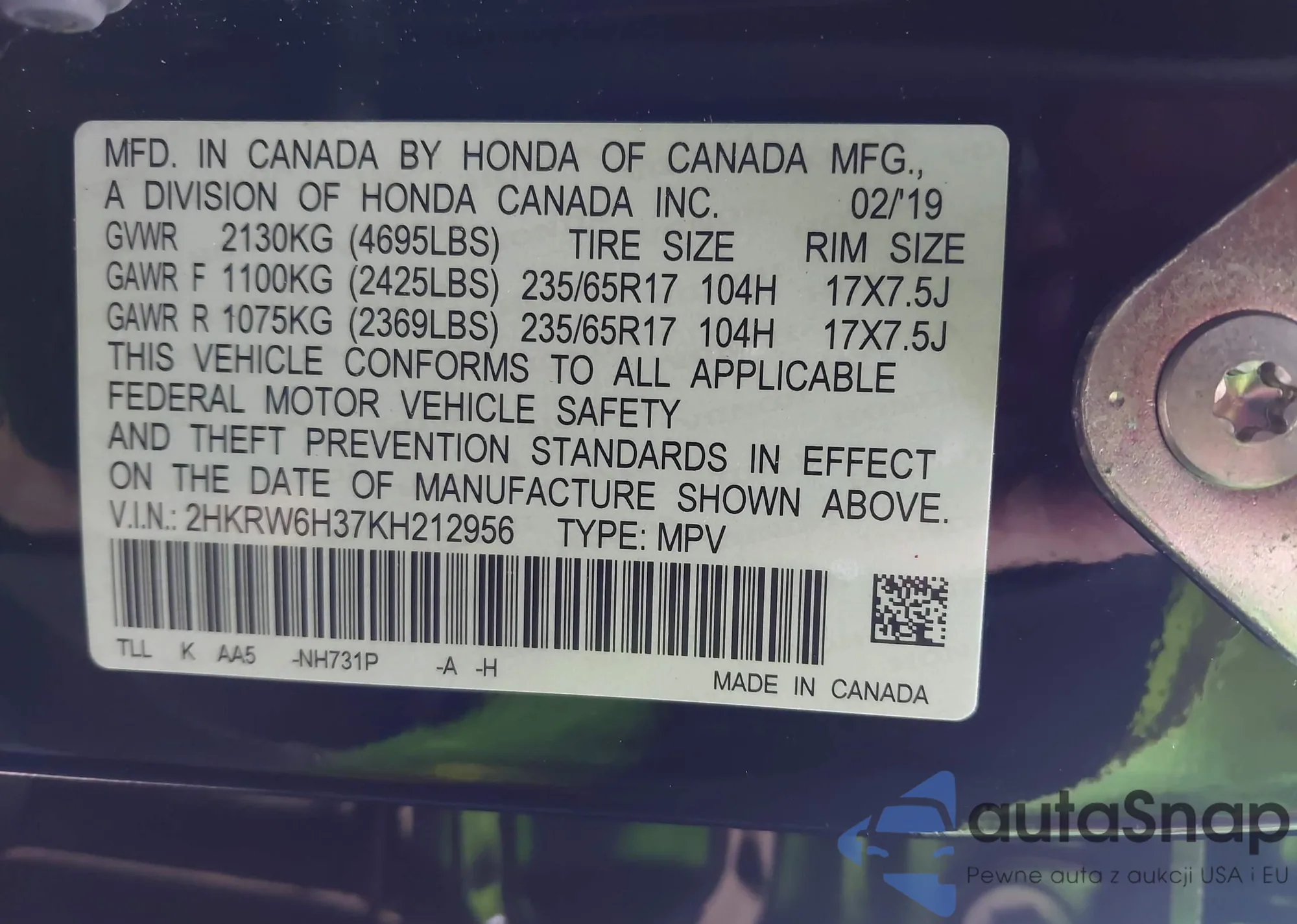 VIN: 2HKRW6H37KH212956