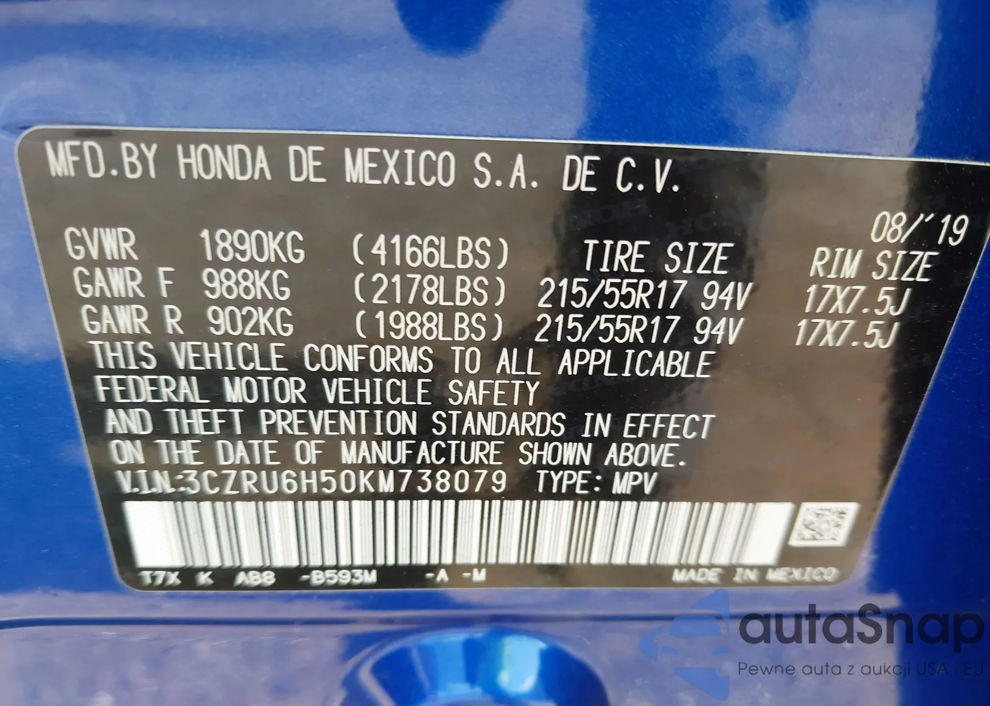 VIN: 3CZRU6H50KM738079