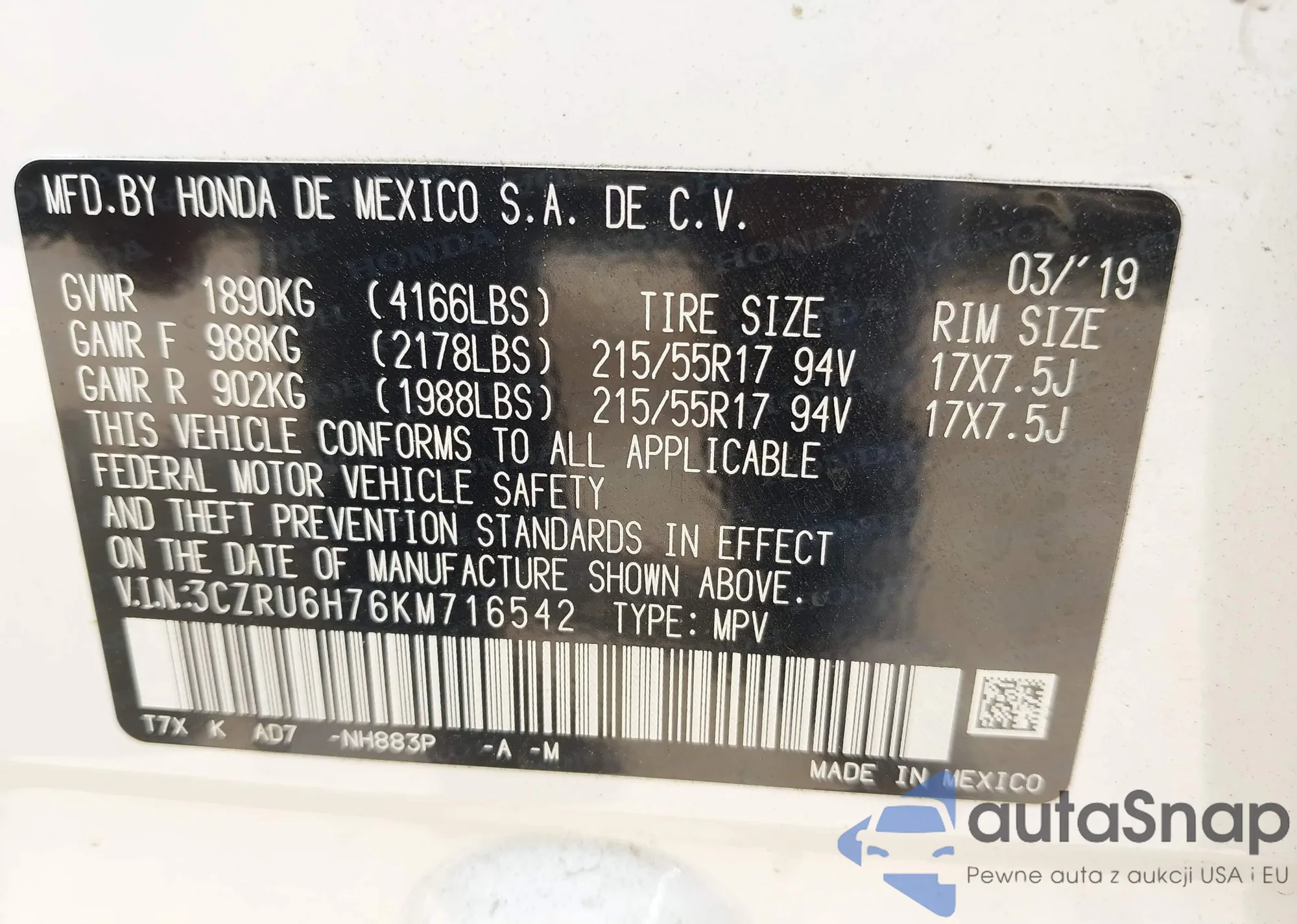 VIN: 3CZRU6H76KM716542