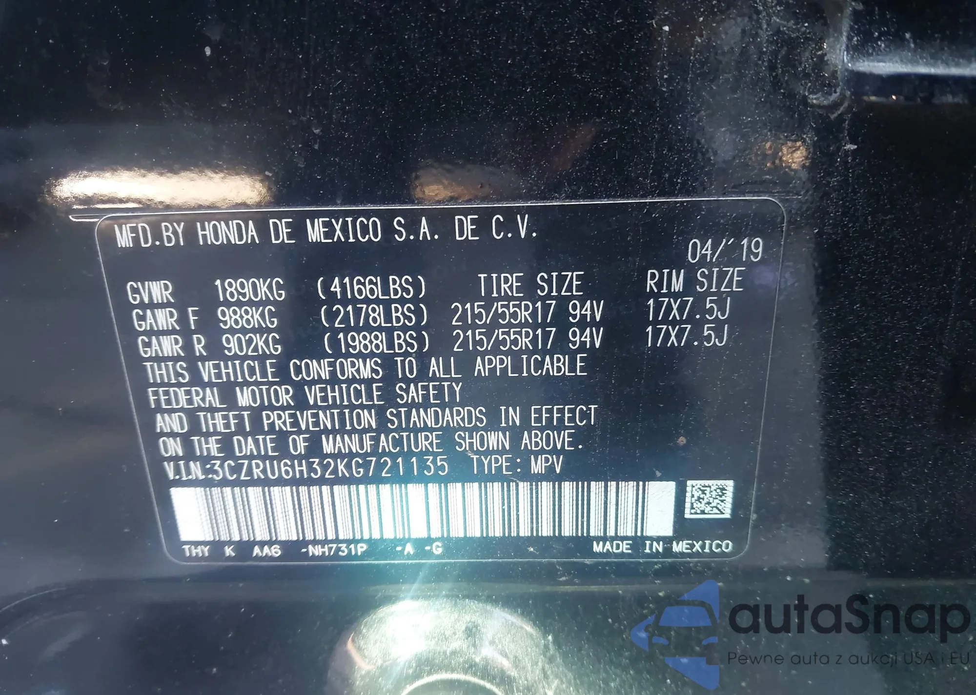 VIN: 3CZRU6H32KG721135