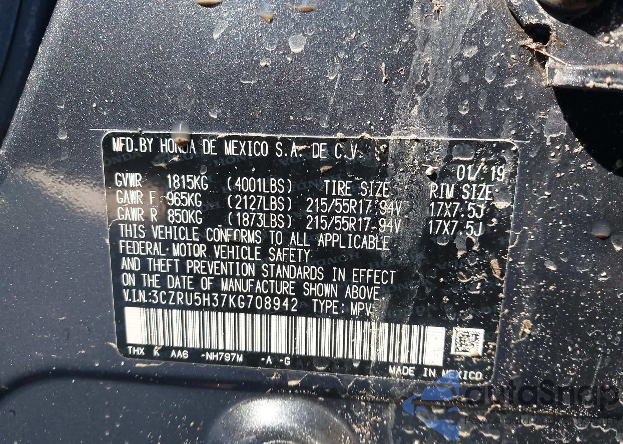 VIN: 3CZRU5H37KG708942