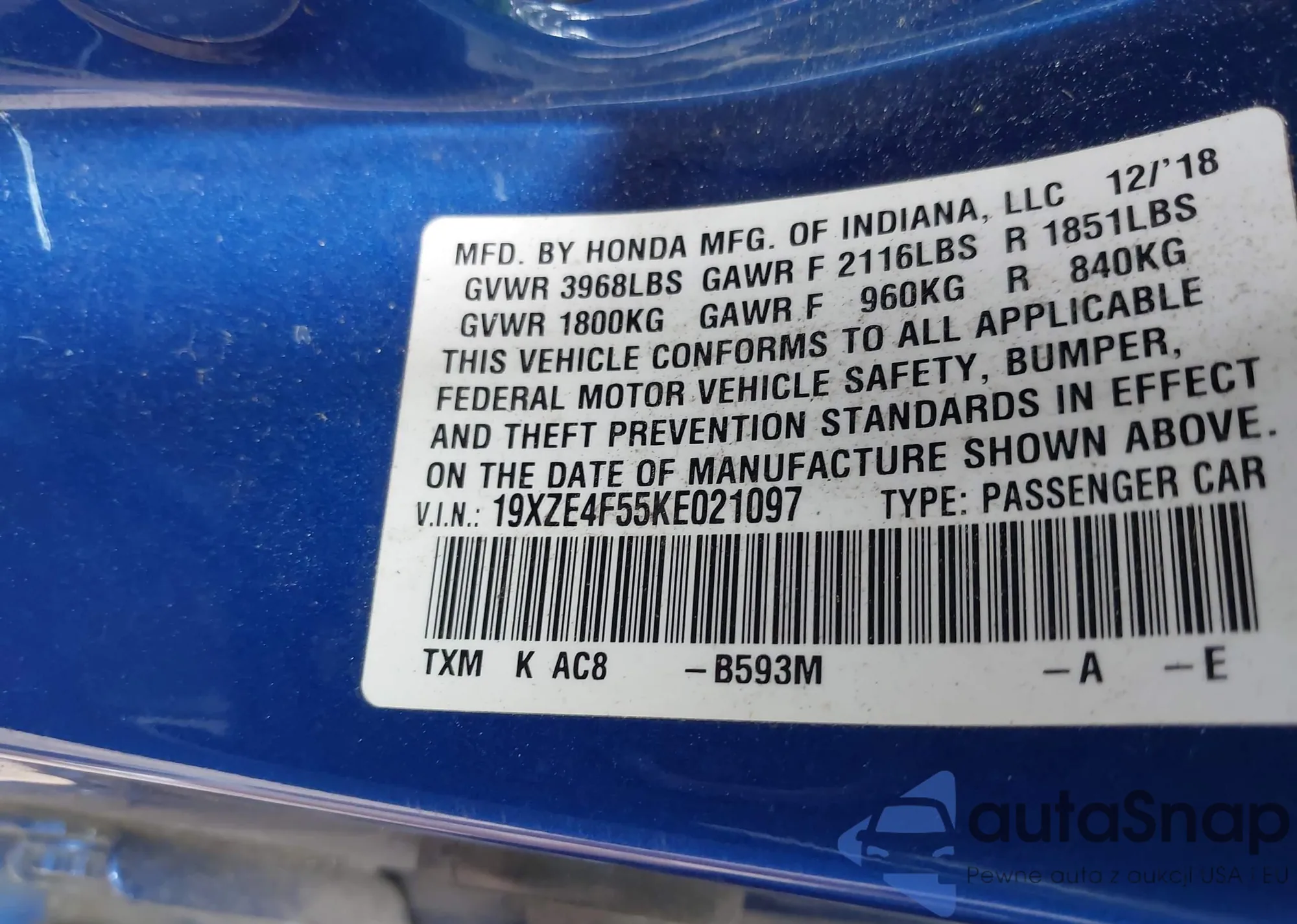 VIN: 19XZE4F55KE021097