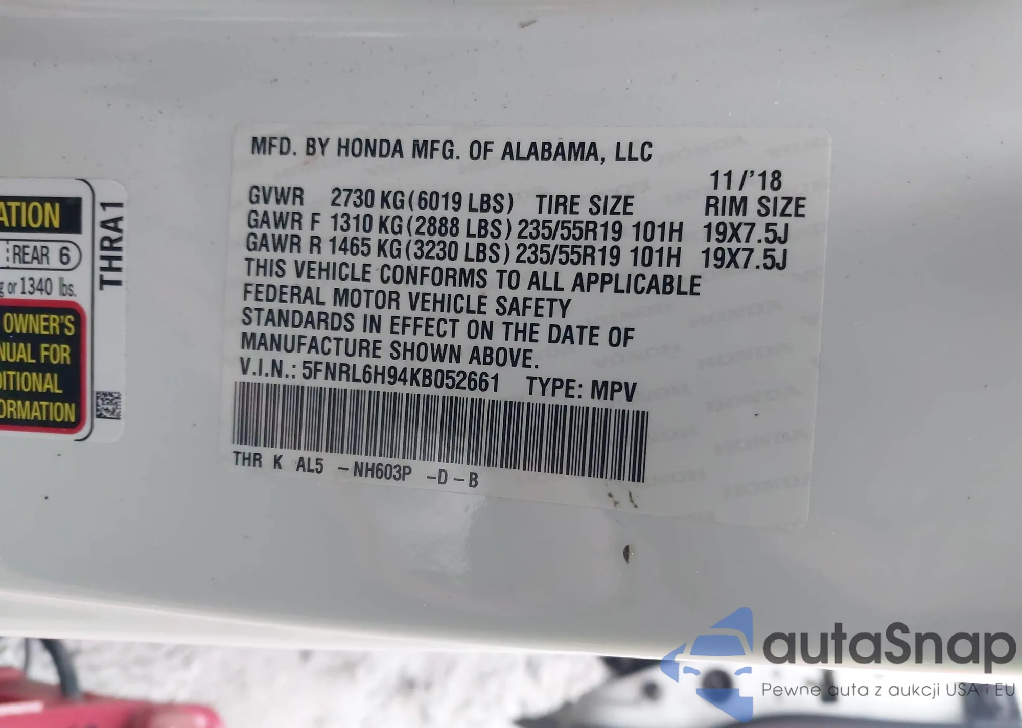 Samochód Honda Odyssey 2019 (VIN 5FNRL6H94KB052661) nie był wcześniej licytowany. Dokumenty są czyste, przebieg odpowiada lub jest niższy niż średnia rynku. Sprzedaje go firma ubezpieczeniowa – polecamy zakup. Dostawa do portu zajmie ok. 6–8 tygodni.