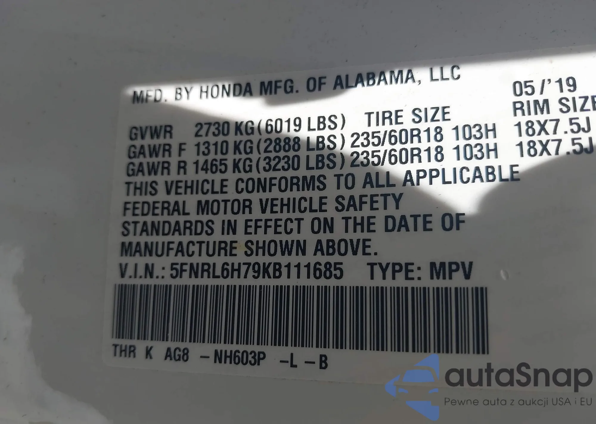 VIN: 5FNRL6H79KB111685