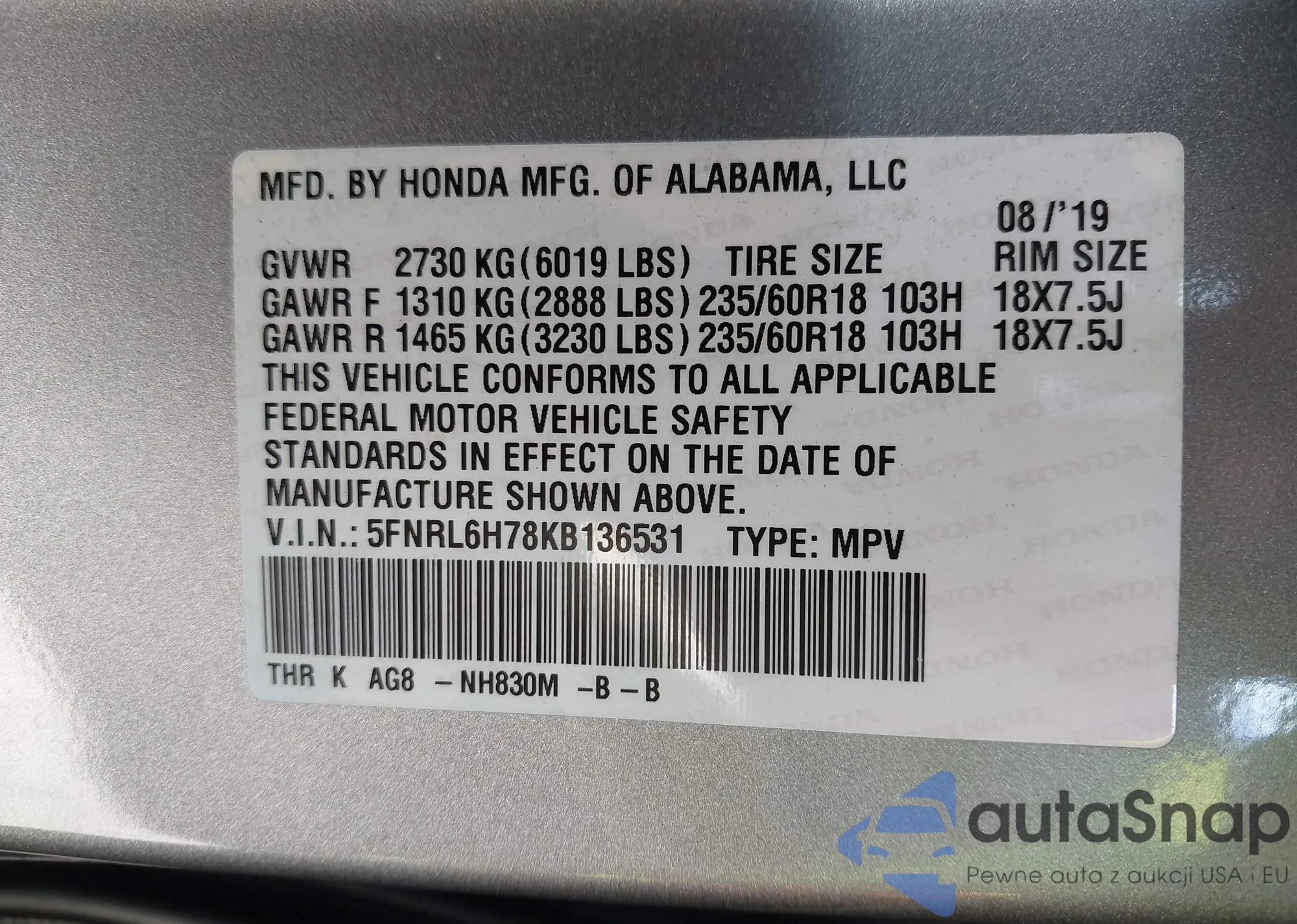 VIN: 5FNRL6H78KB136531