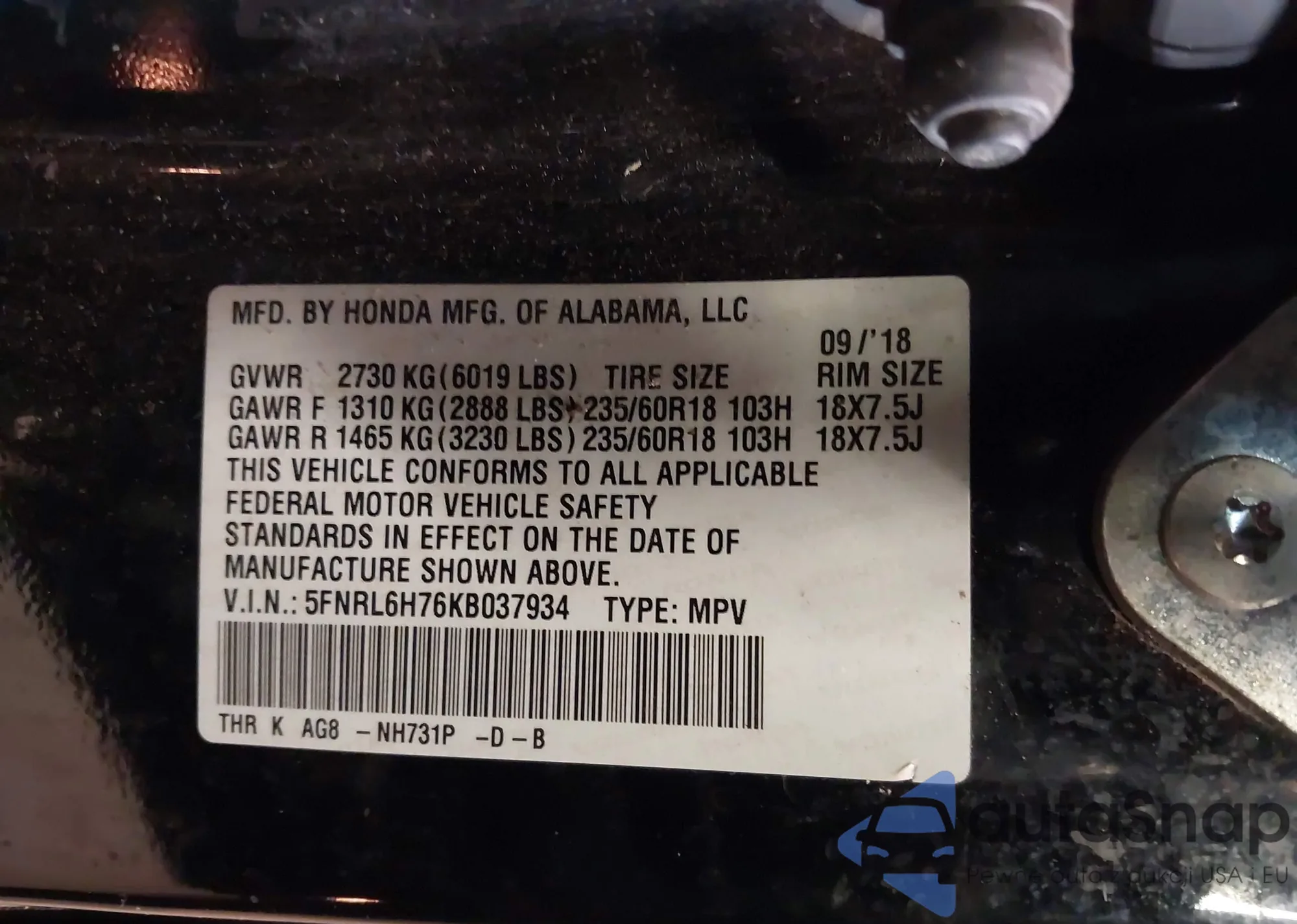 VIN: 5FNRL6H76KB037934