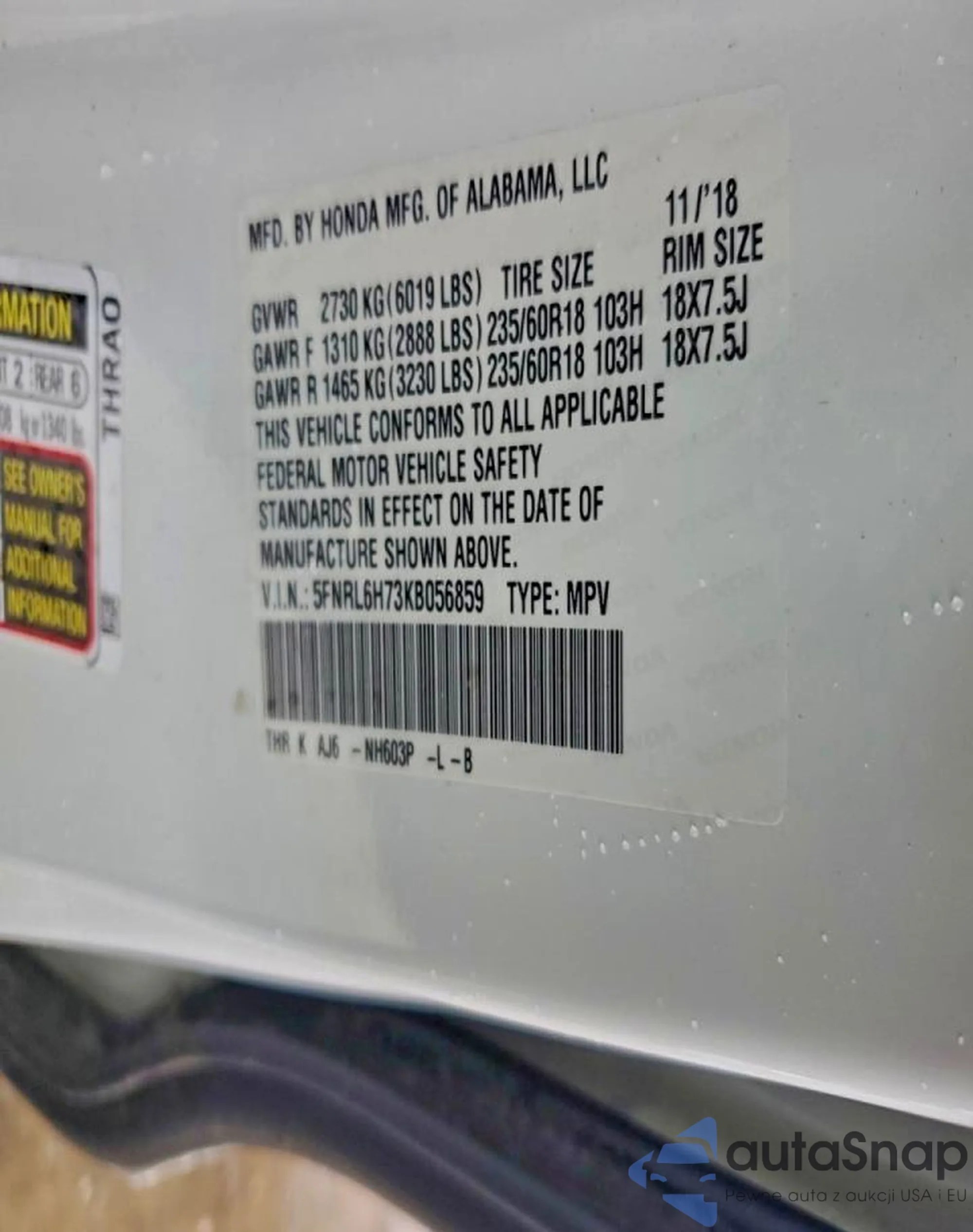 Samochód Honda Odyssey 2019 (VIN 5FNRL6H73KB056859) nie był wcześniej licytowany. Dokumenty są czyste, przebieg odpowiada lub jest niższy niż średnia rynku. Sprzedaje go firma ubezpieczeniowa – polecamy zakup. Dostawa do portu zajmie ok. 6–8 tygodni.