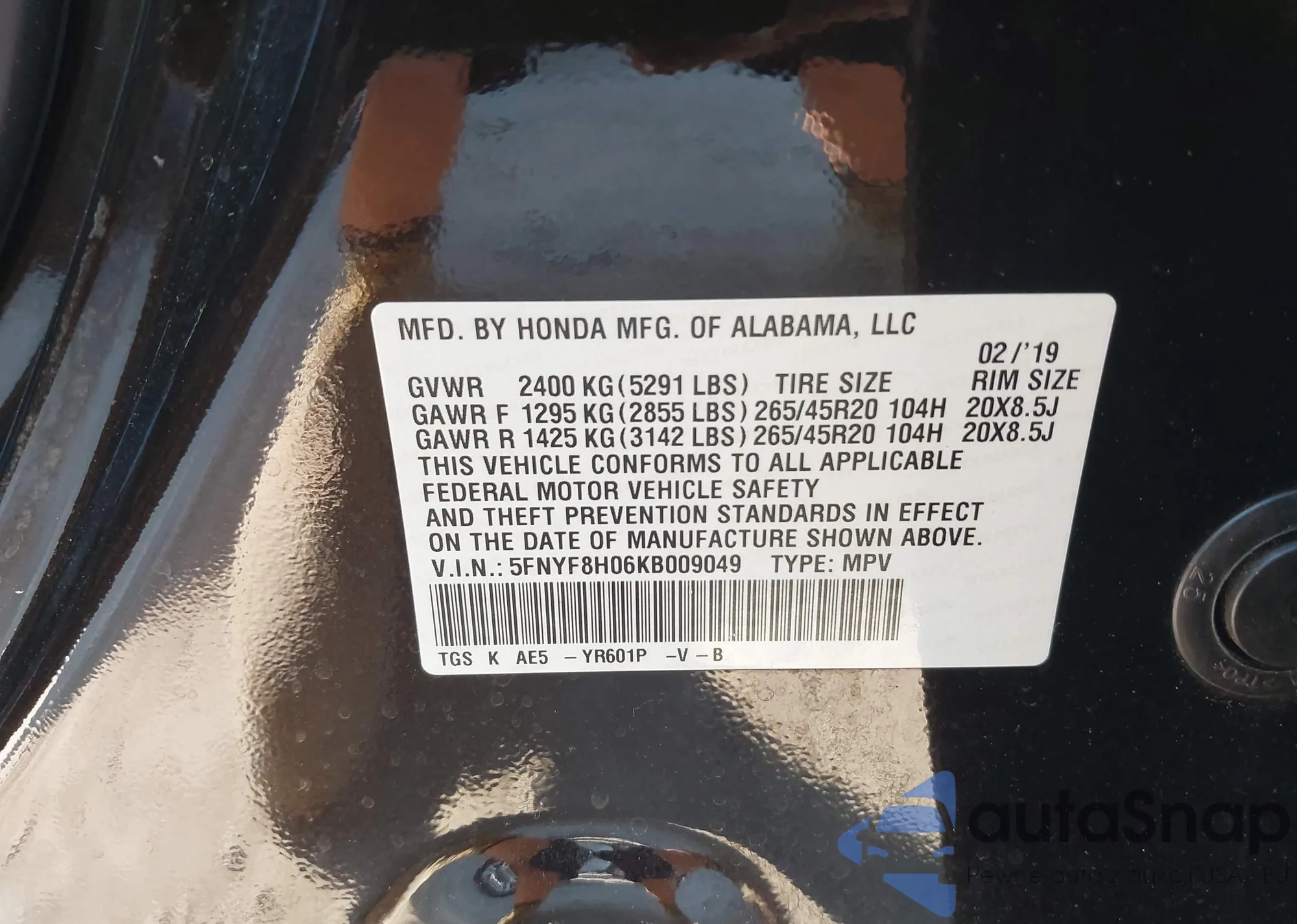 • VIN: 5FNYF8H06KB009049