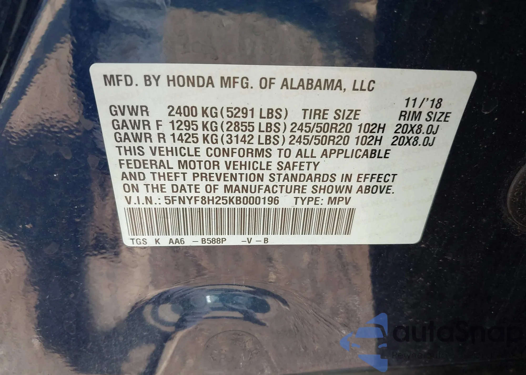 VIN: 5FNYF8H25KB000196