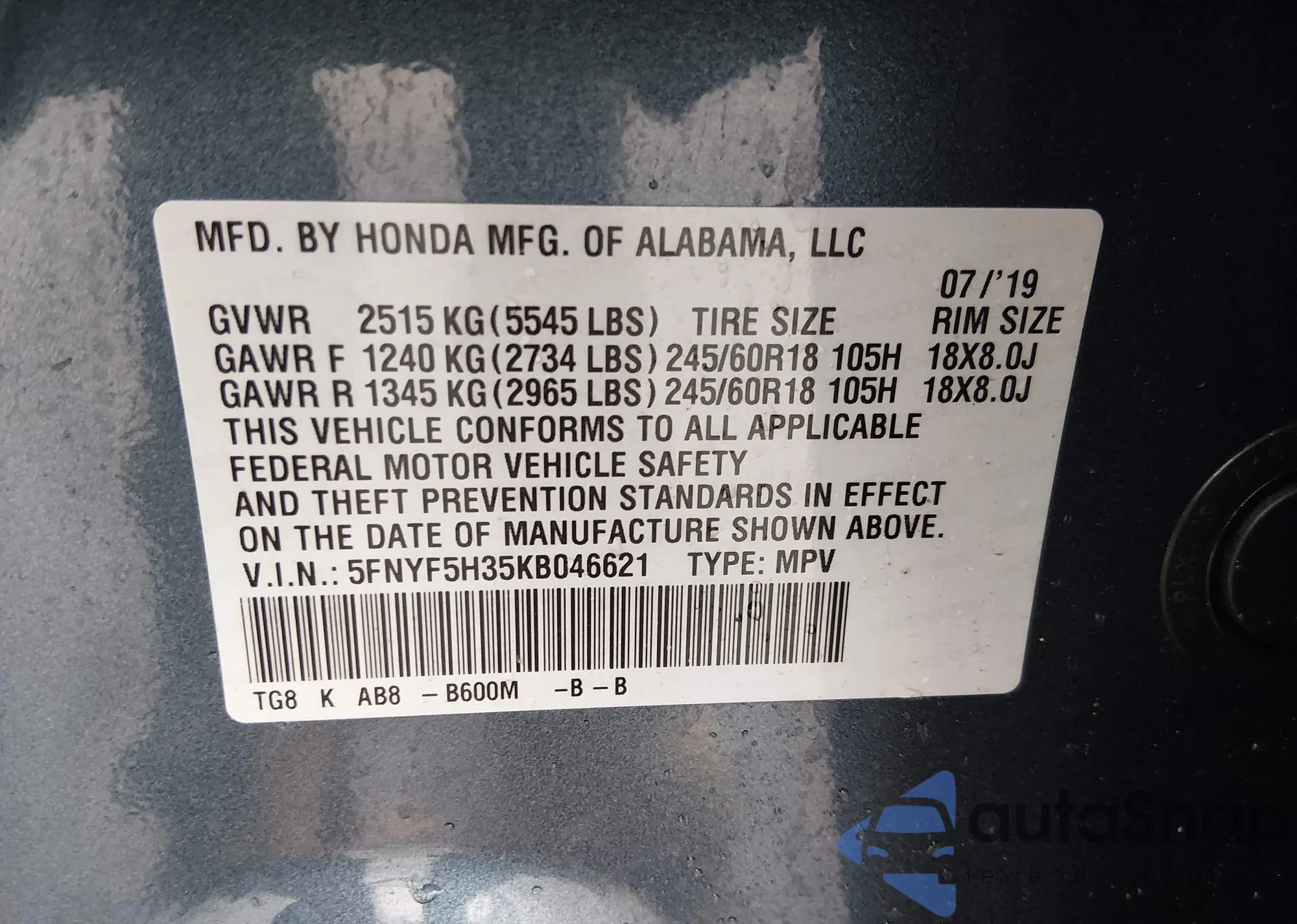 VIN: 5FNYF5H35KB046621