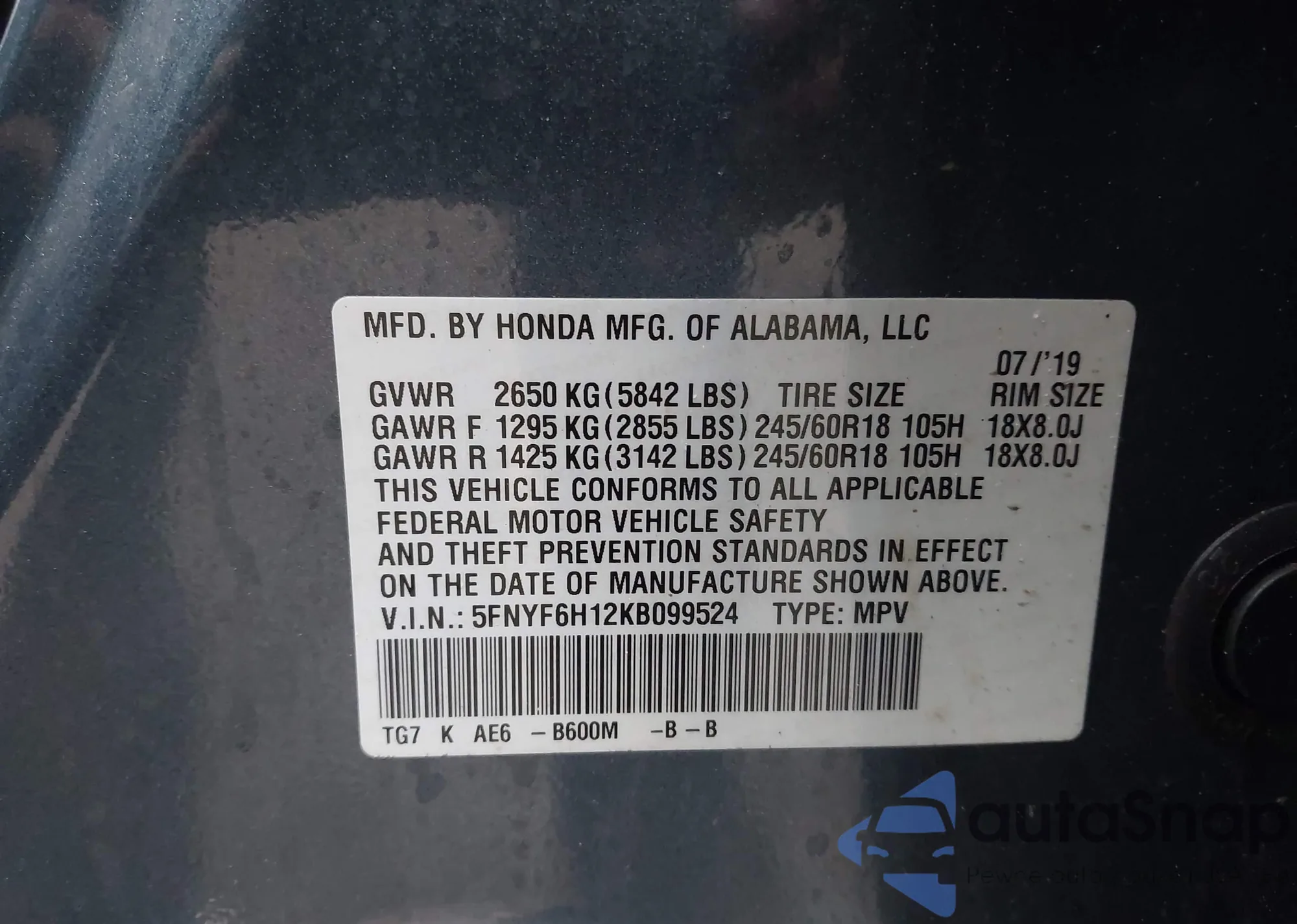 VIN: 5FNYF6H12KB099524