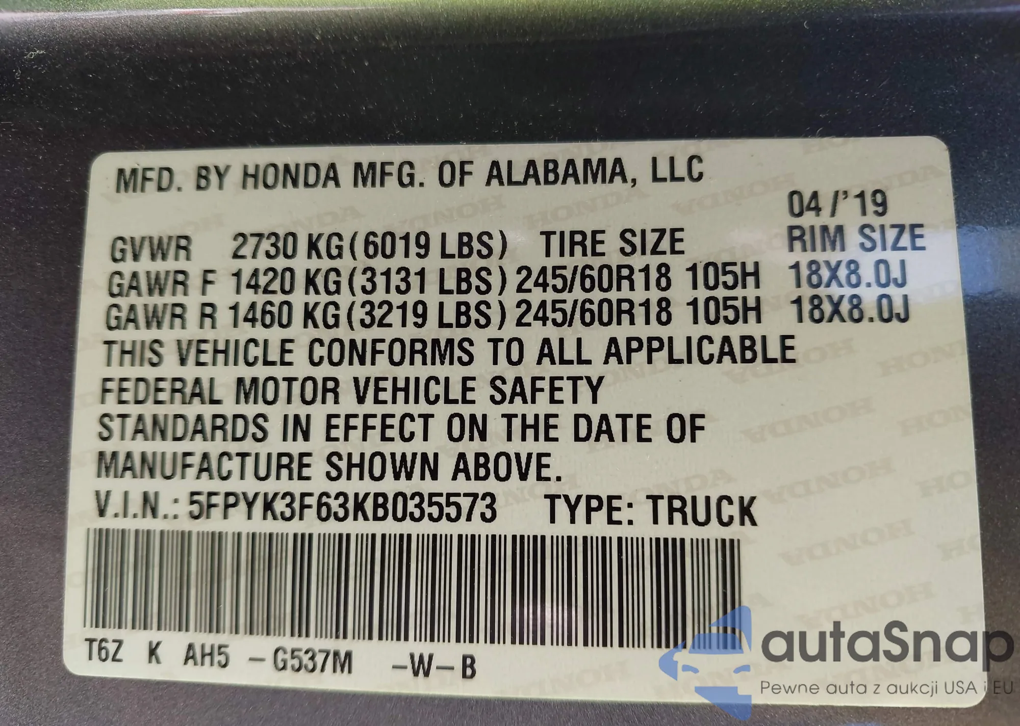 • VIN: 5FPYK3F63KB035573