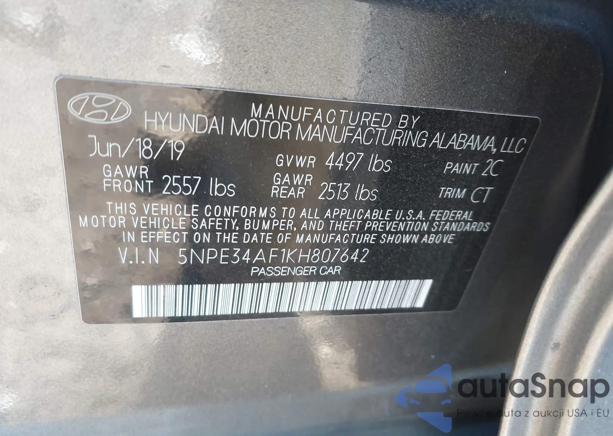 Samochód Hyundai Sonata 2019 (VIN 5NPE34AF1KH807642) nie był wcześniej licytowany. Dokumenty są czyste, przebieg odpowiada lub jest niższy niż średnia rynku. Sprzedaje go firma ubezpieczeniowa – polecamy zakup. Dostawa do portu zajmie ok. 6–8 tygodni.