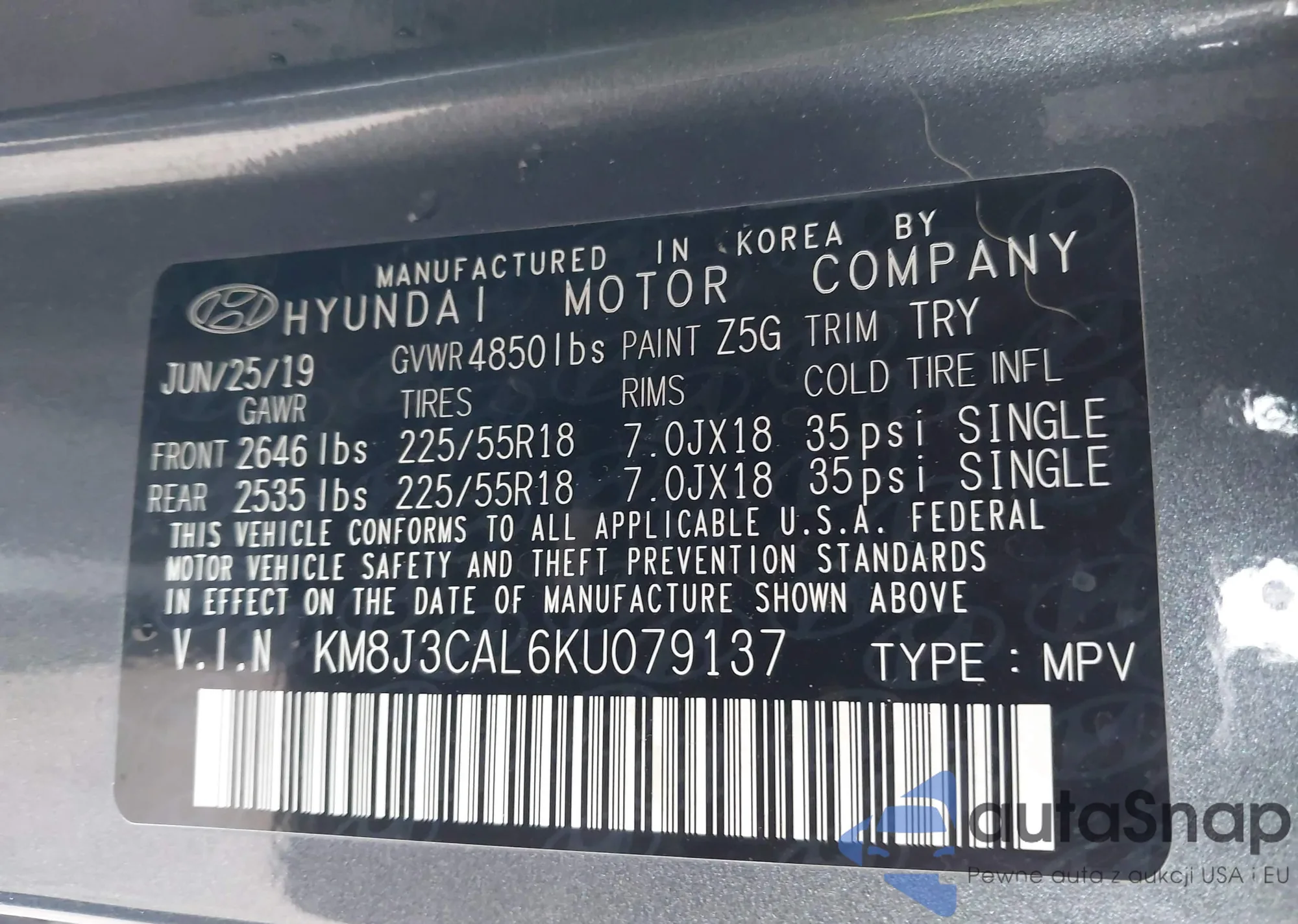 • VIN: KM8J3CAL6KU079137