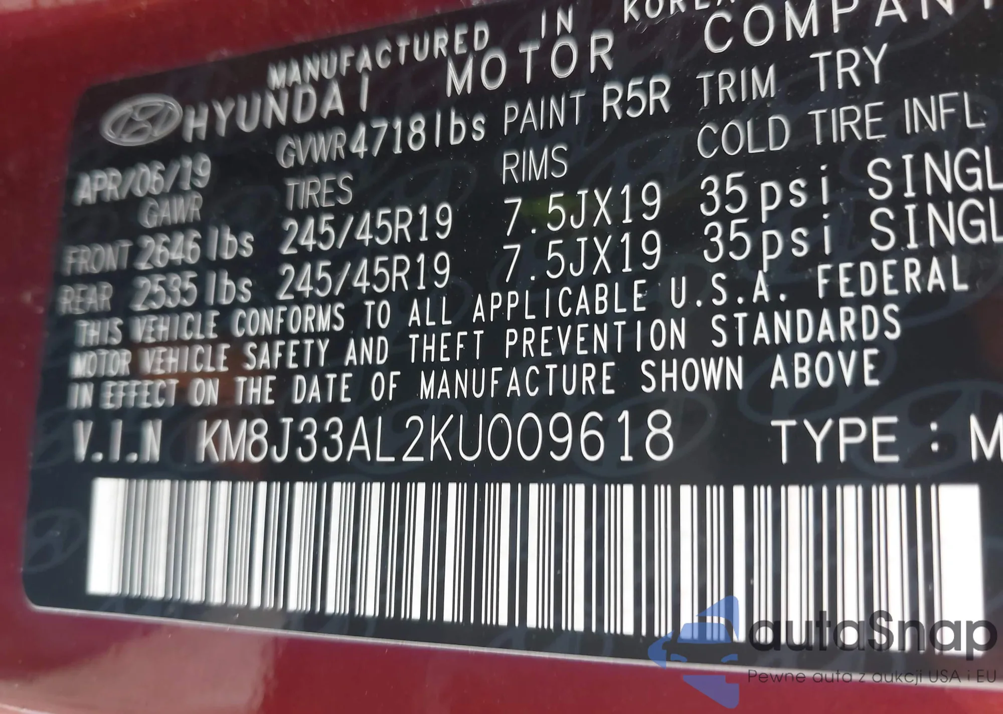 Samochód Hyundai Tucson 2019 (VIN KM8J33AL2KU009618) nie był wcześniej licytowany. Dokumenty są czyste, przebieg odpowiada lub jest niższy niż średnia rynku. Sprzedaje go firma ubezpieczeniowa – polecamy zakup. Dostawa do portu zajmie ok. 6–8 tygodni.
