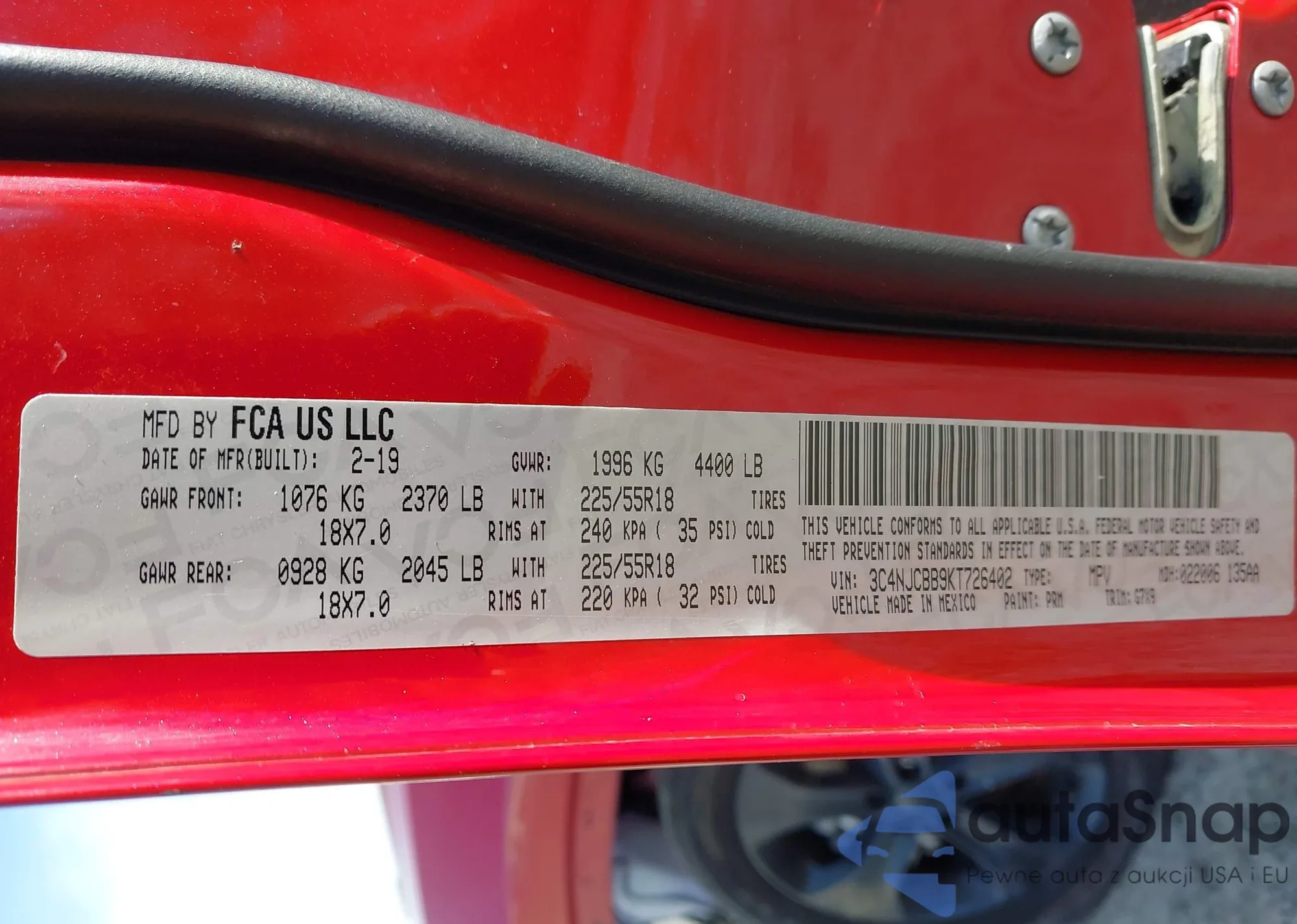 Samochód Jeep Compass 2019 (VIN 3C4NJCBB9KT726402) nie był wcześniej licytowany. Dokumenty są czyste, przebieg odpowiada lub jest niższy niż średnia rynku. Sprzedaje go firma ubezpieczeniowa – polecamy zakup. Dostawa do portu zajmie ok. 6–8 tygodni.