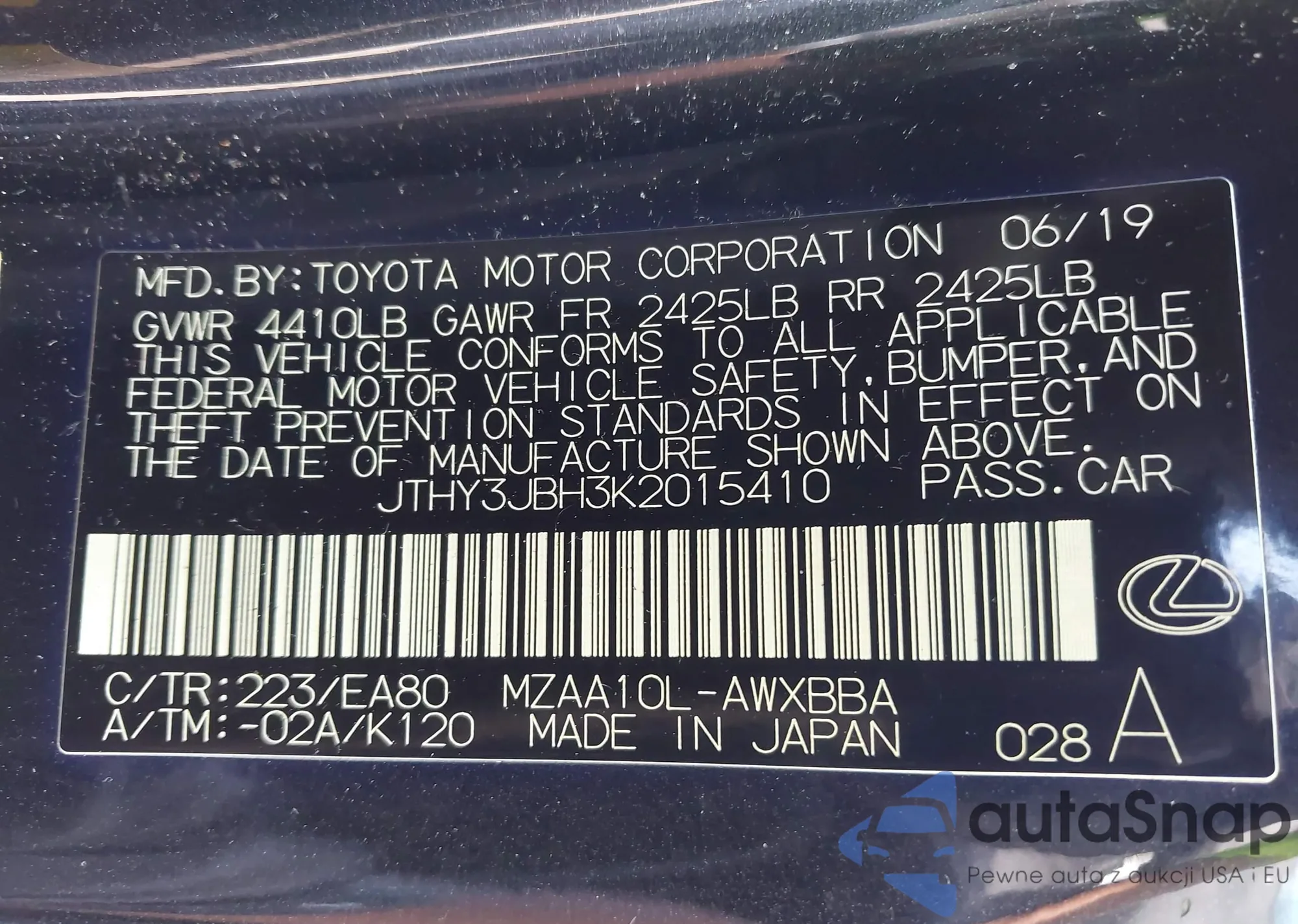 • VIN: JTHY3JBH3K2015410