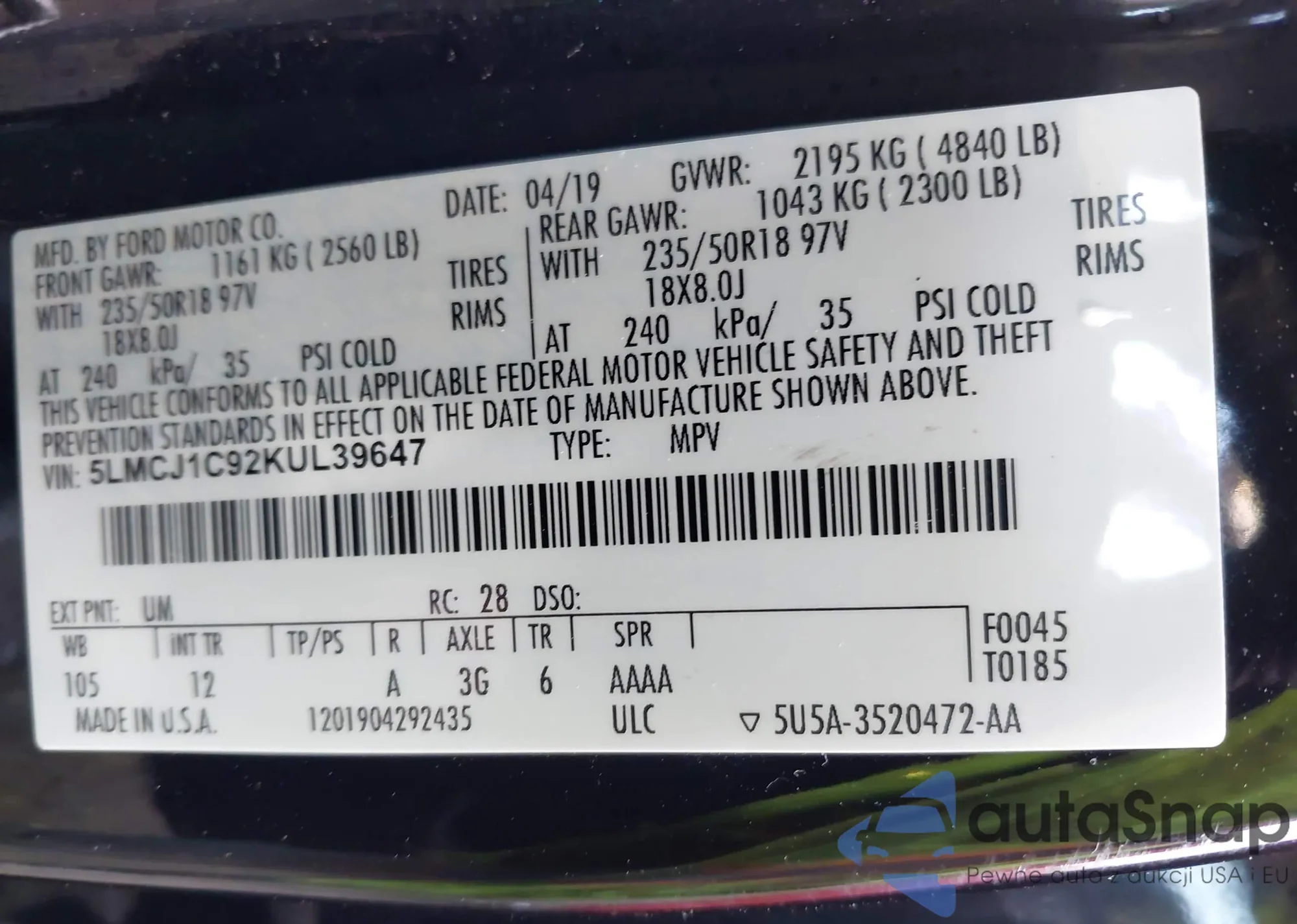 Samochód Lincoln MKC 2019 (VIN 5LMCJ1C92KUL39647) nie był wcześniej licytowany. Dokumenty są czyste, przebieg odpowiada lub jest niższy niż średnia rynku. Sprzedaje go firma ubezpieczeniowa – polecamy zakup. Dostawa do portu zajmie ok. 6–8 tygodni.